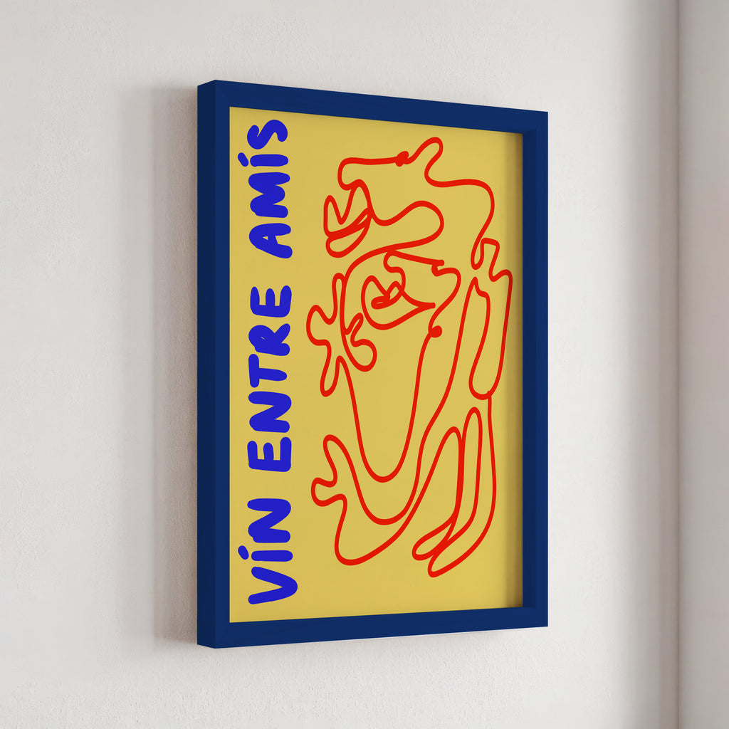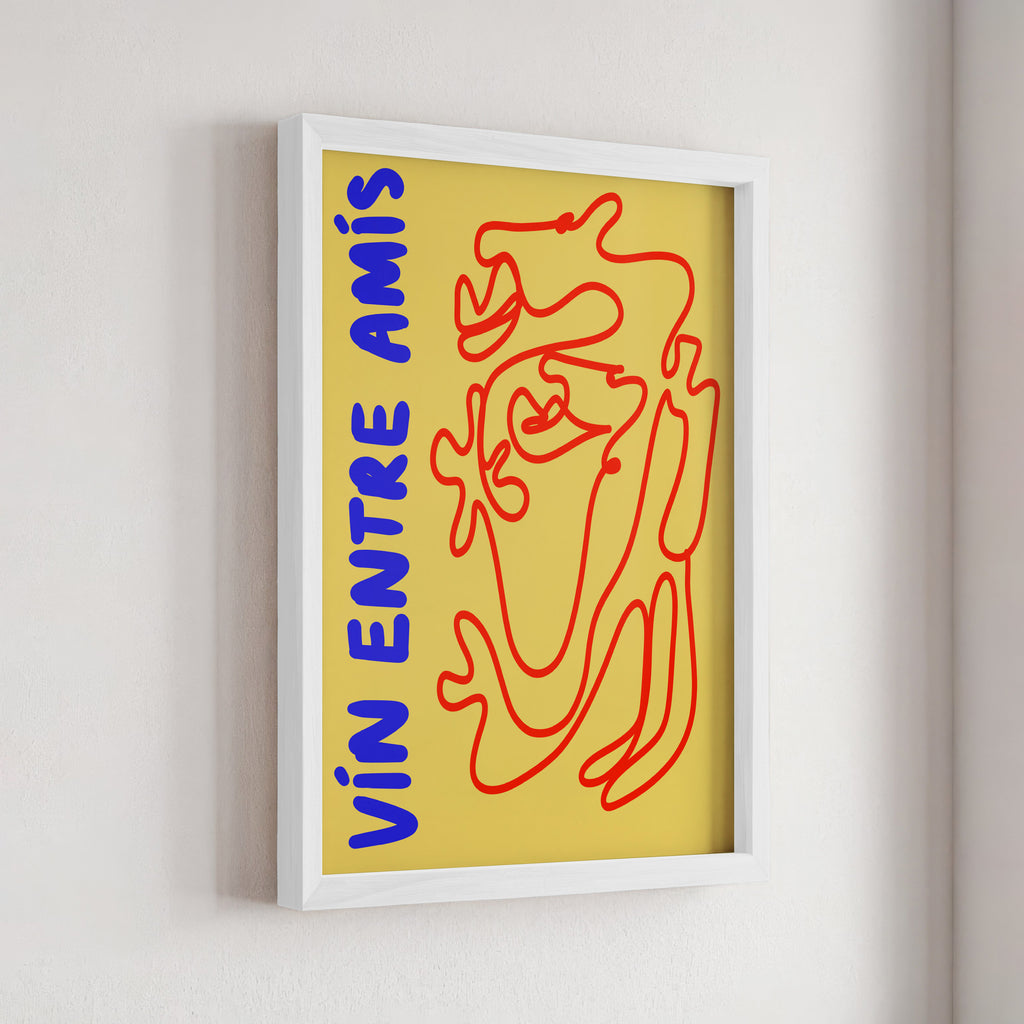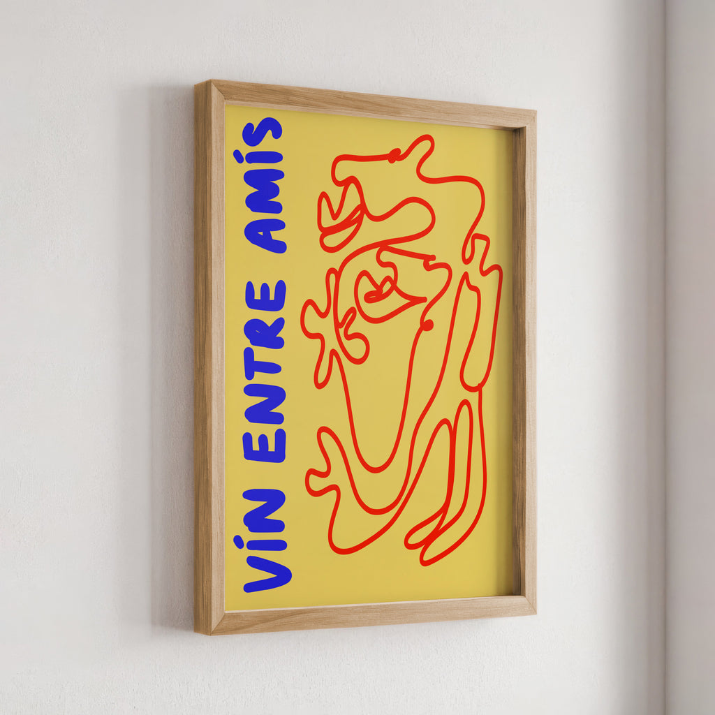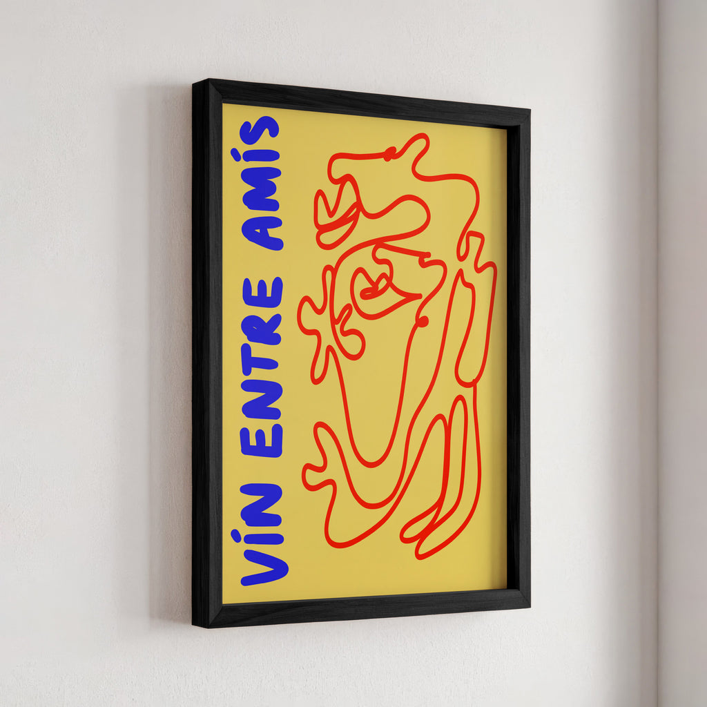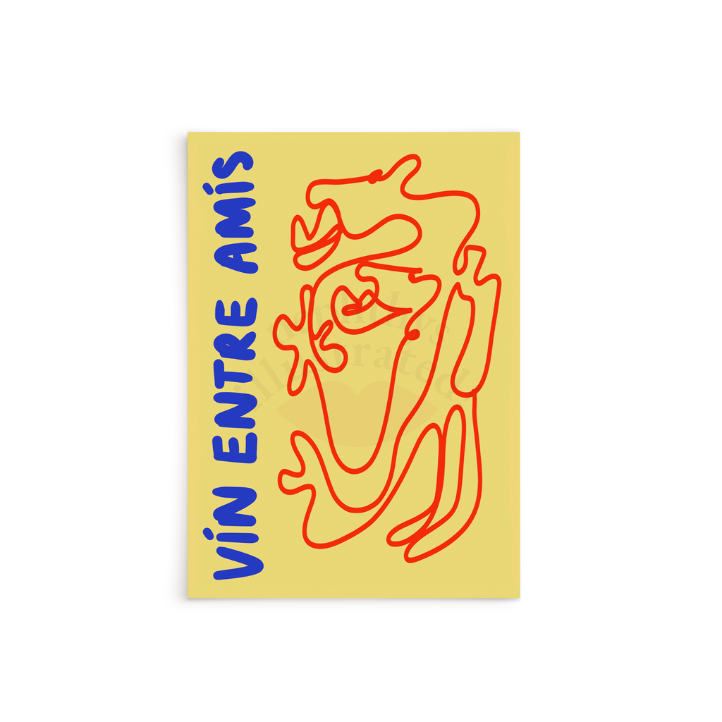 A single line drawing accompanied by the French words “Vin entre amis” translating to “drinks with friends” in English.