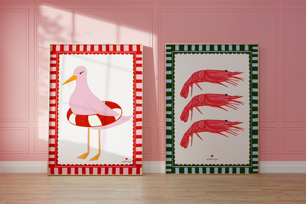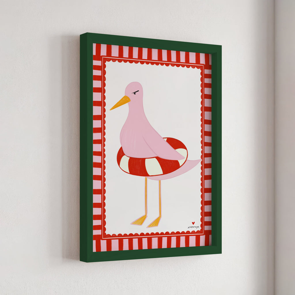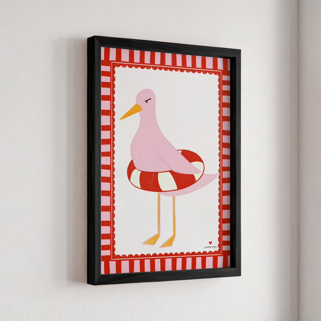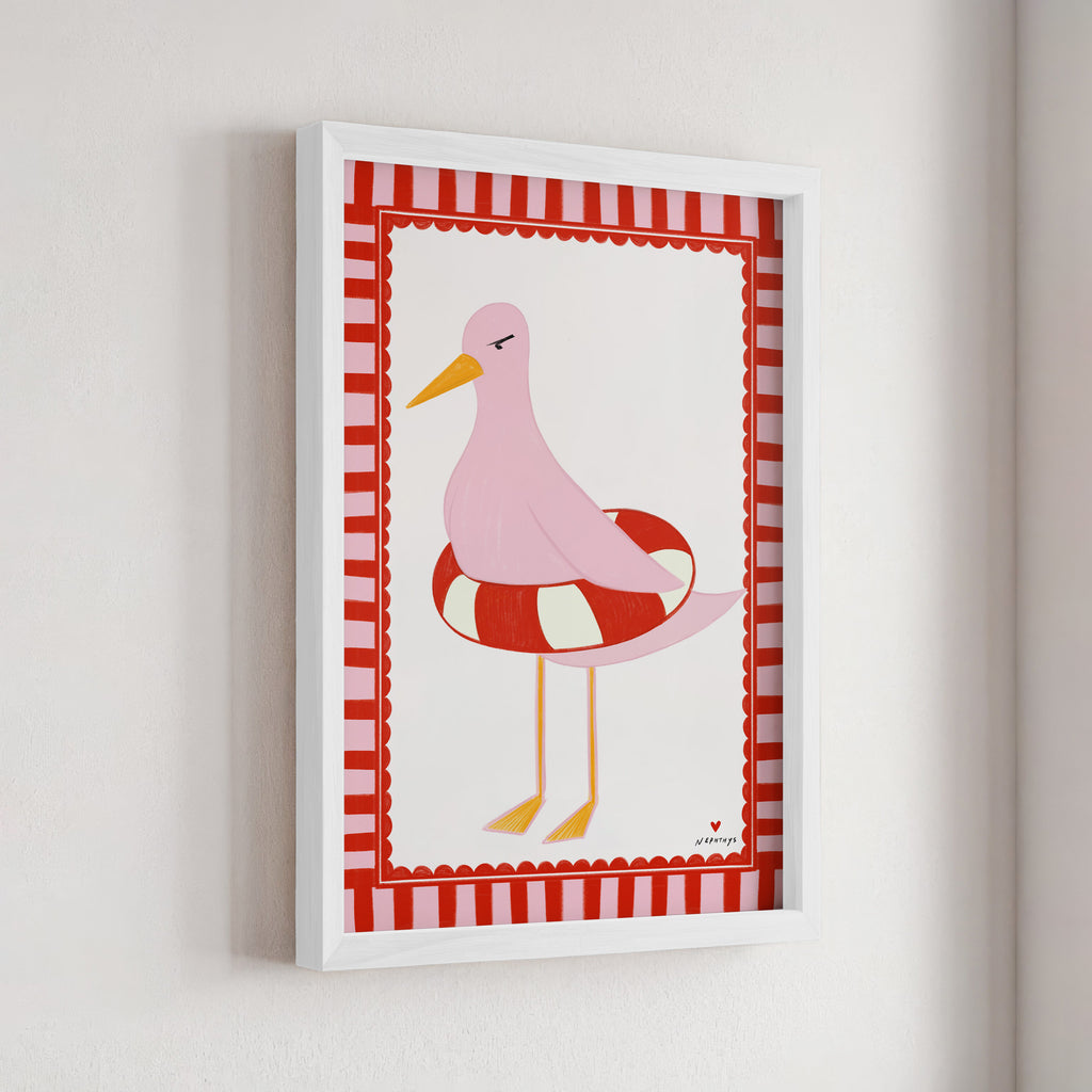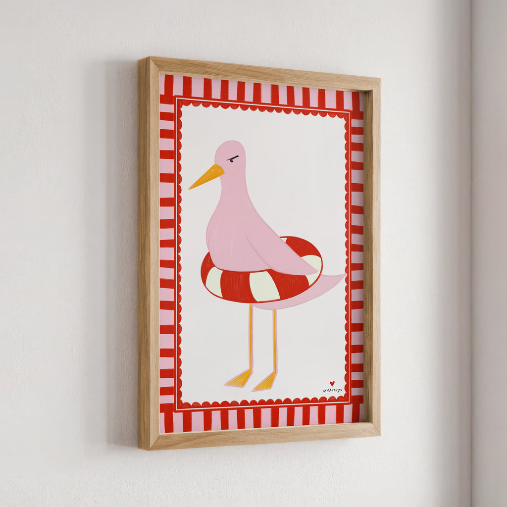 Inspired by the British seaside, this print features a whimsical pink seagull, capturing the charm and playful spirit of a day by the shore.