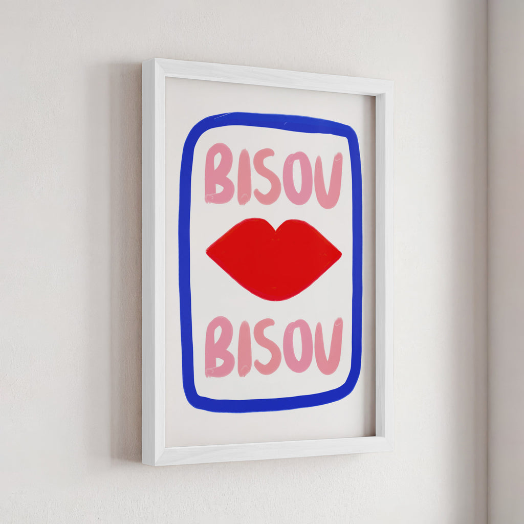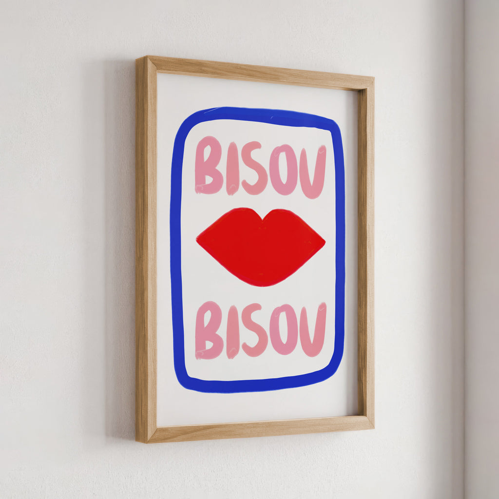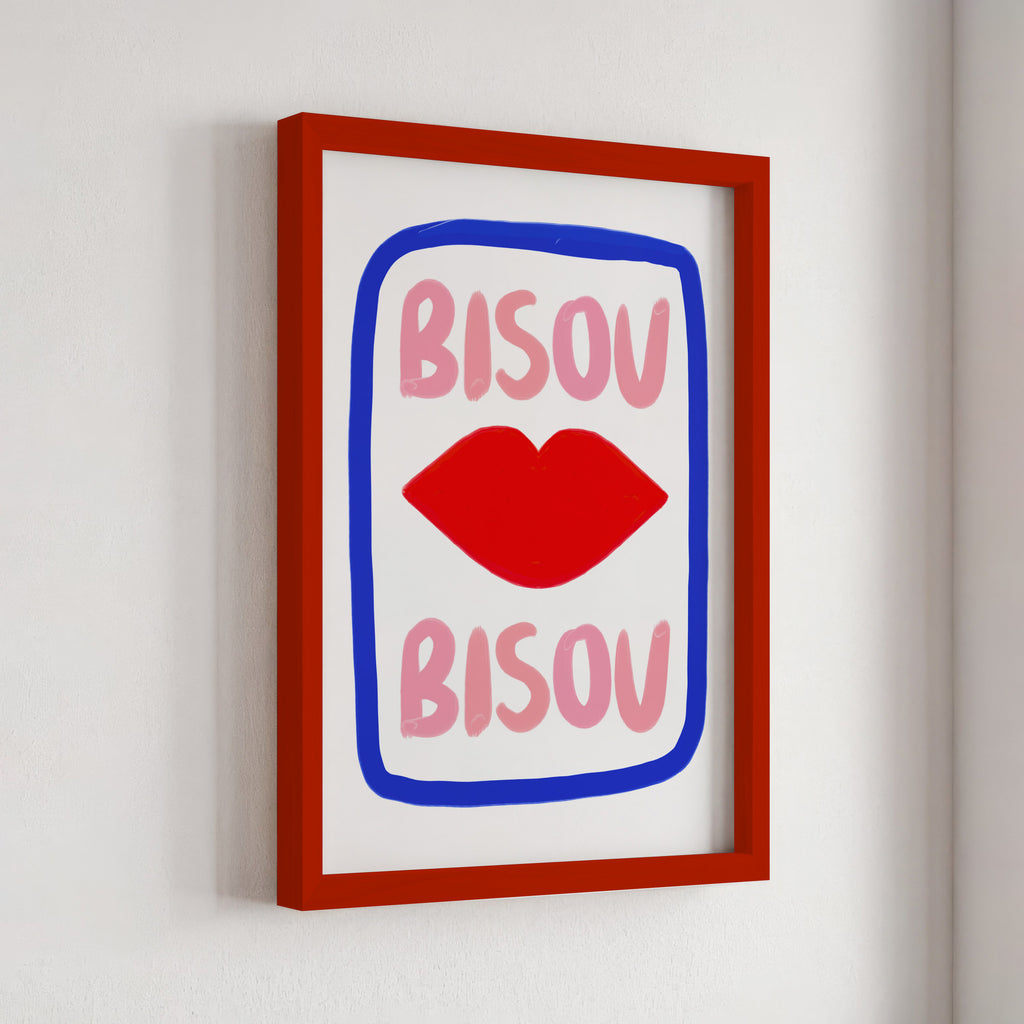 Bisou Bisou," a cult favourite and best-seller, features bold red painted lips and a vibrant blue border, meaning "kiss kiss" in French.