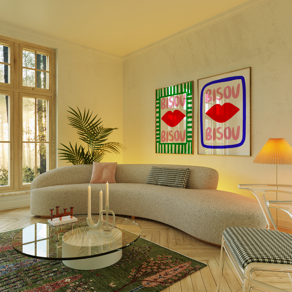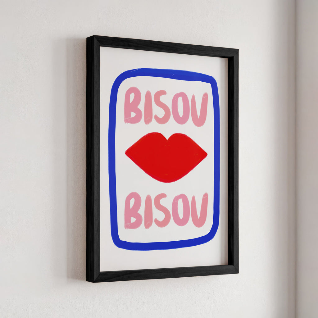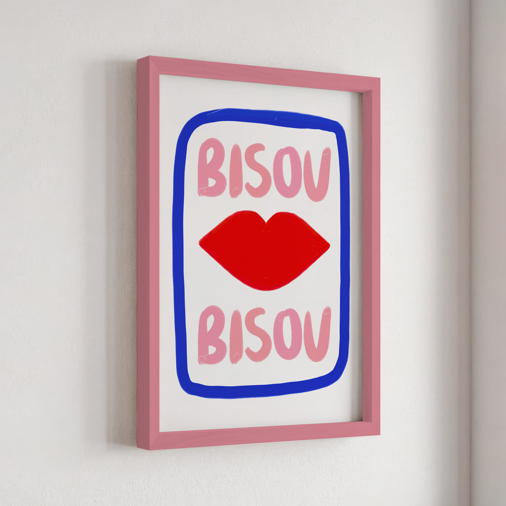 Bisou Bisou," a cult favourite and best-seller, features bold red painted lips and a vibrant blue border, meaning "kiss kiss" in French.
