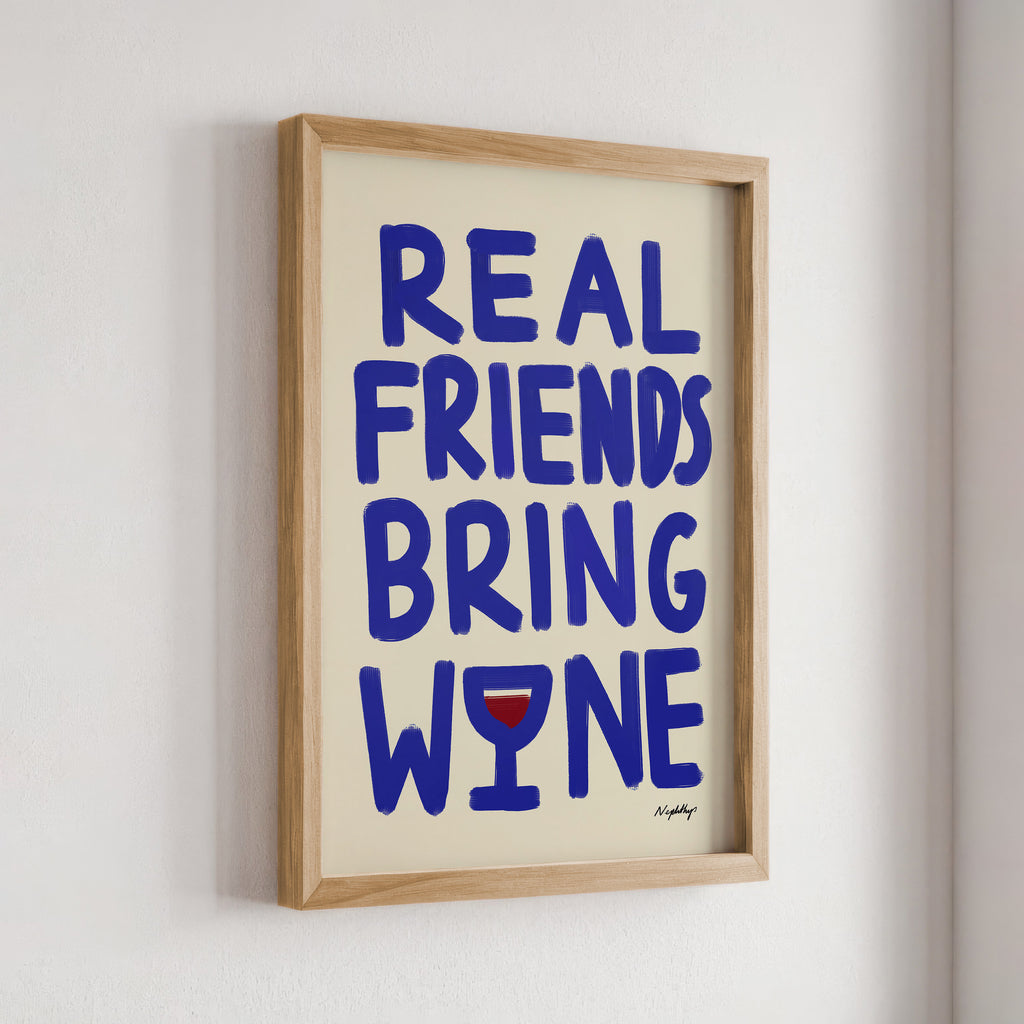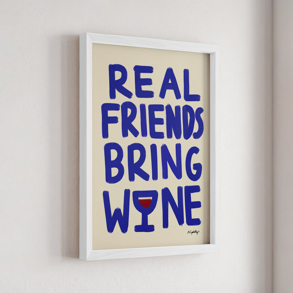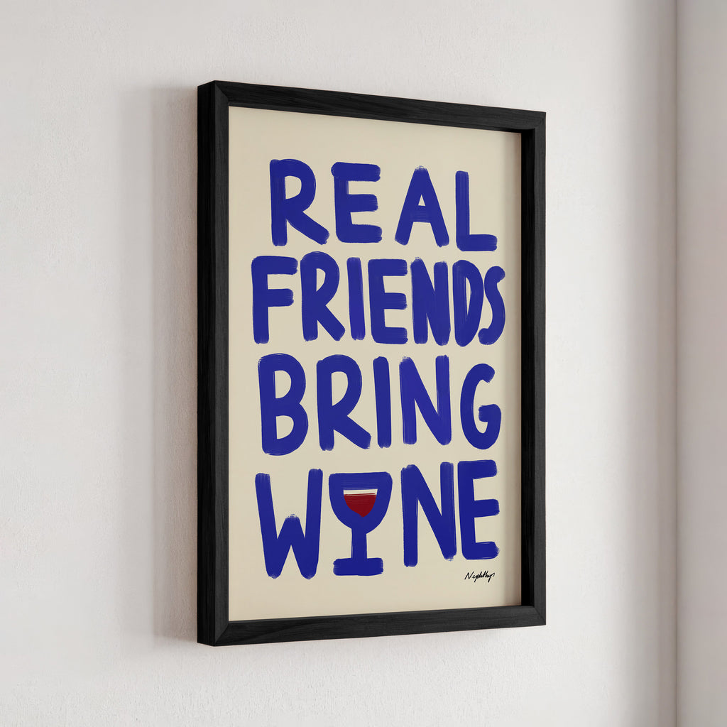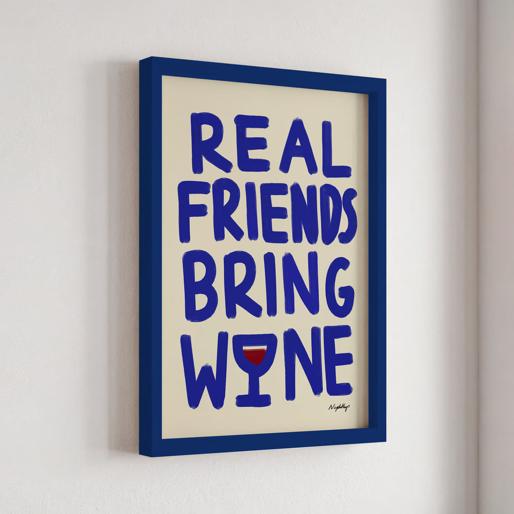 Celebrate the camaraderie of true friendship with our 'Real Friends Bring Wine' print – another one of our cult classic prints. Painted with bold blue acrylic, this statement piece is a tribute to the bond between real friends and the shared love for good wine.