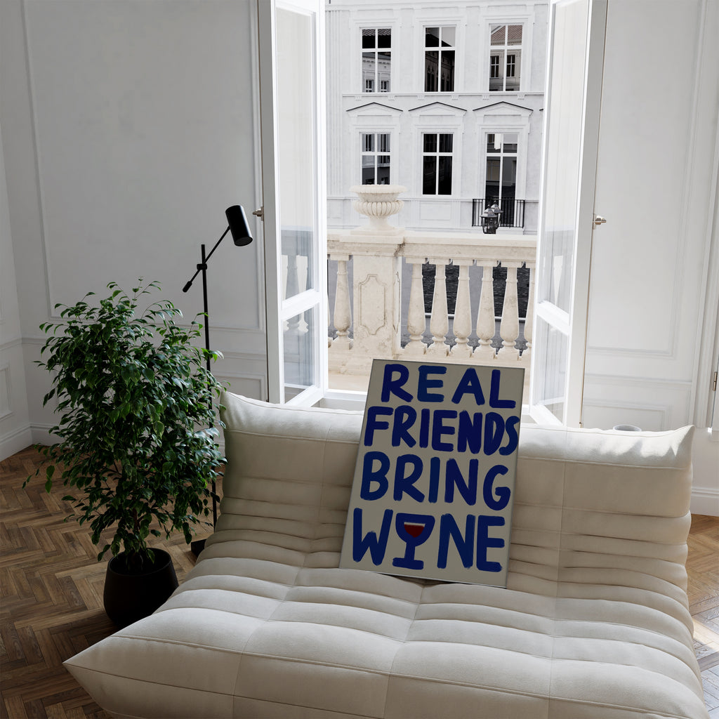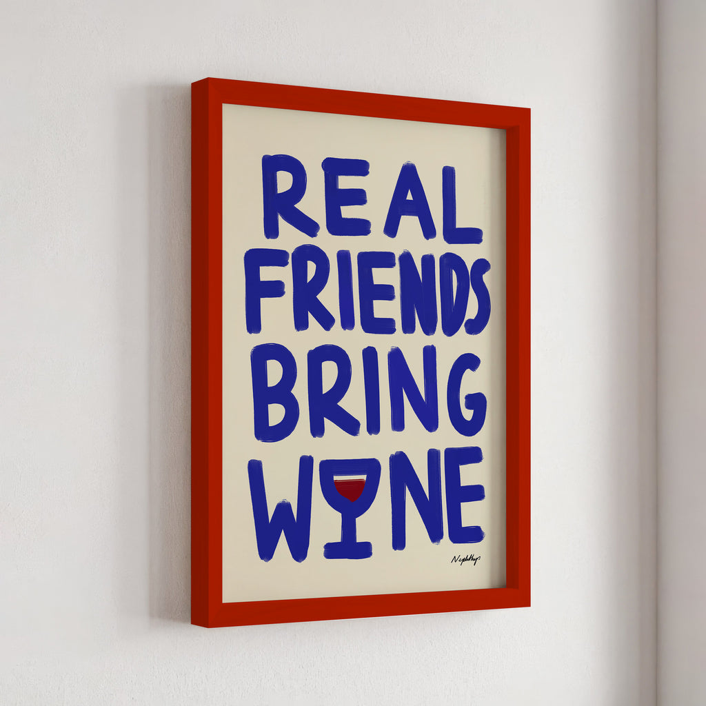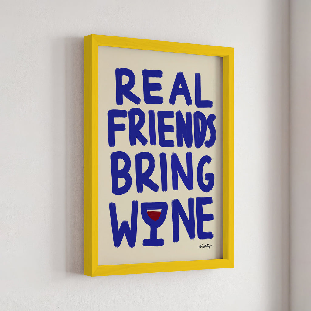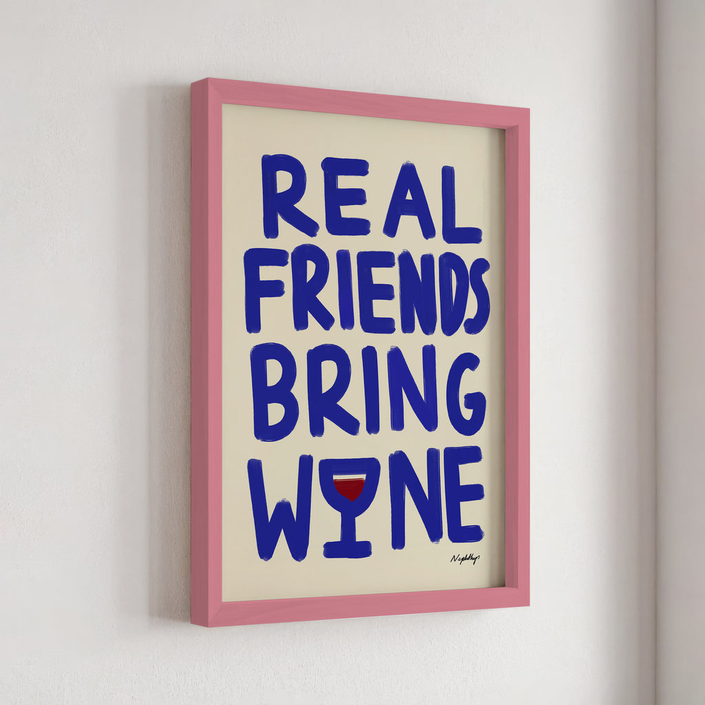 Celebrate the camaraderie of true friendship with our 'Real Friends Bring Wine' print – another one of our cult classic prints. Painted with bold blue acrylic, this statement piece is a tribute to the bond between real friends and the shared love for good wine.