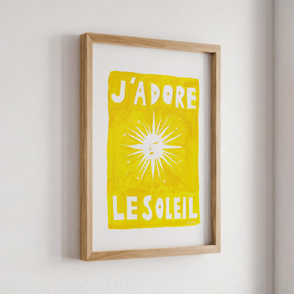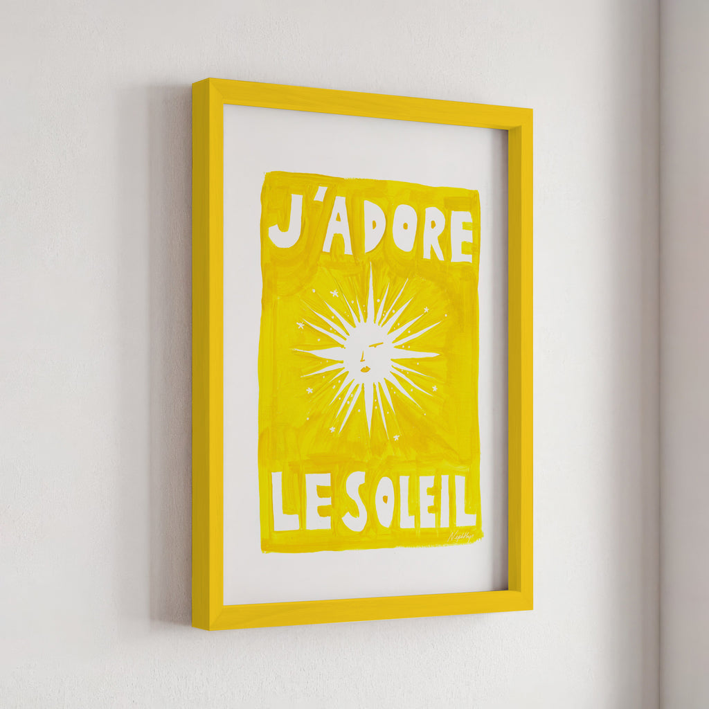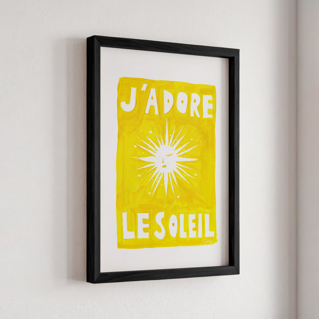 "J'adore le Soleil," meaning "I adore the sun" in French, is a bold handprinted print that embodies the sentiment of a love letter from the sun. Painted in a warm yellow, This print is designed to add a touch of the sunshine to your home.