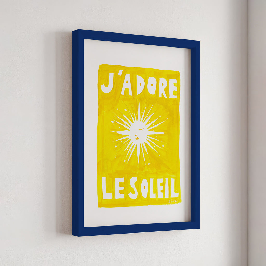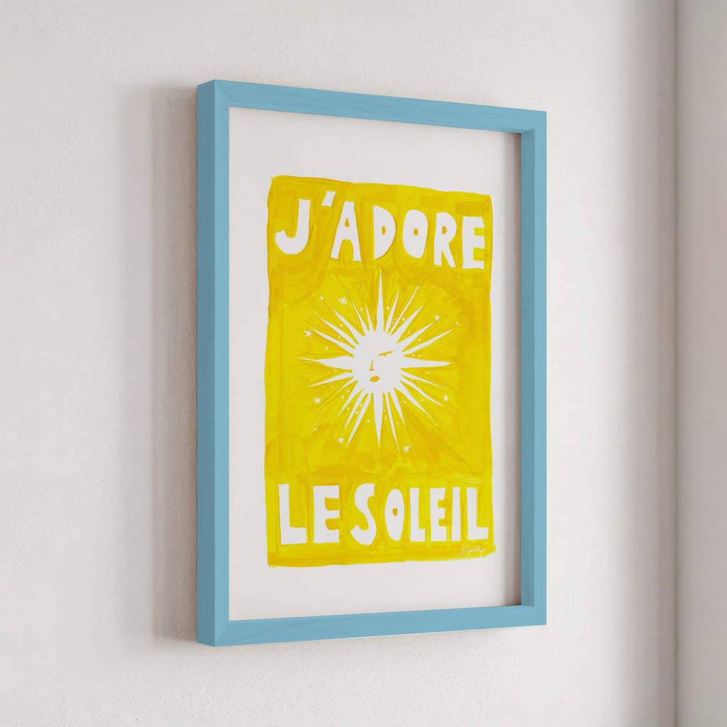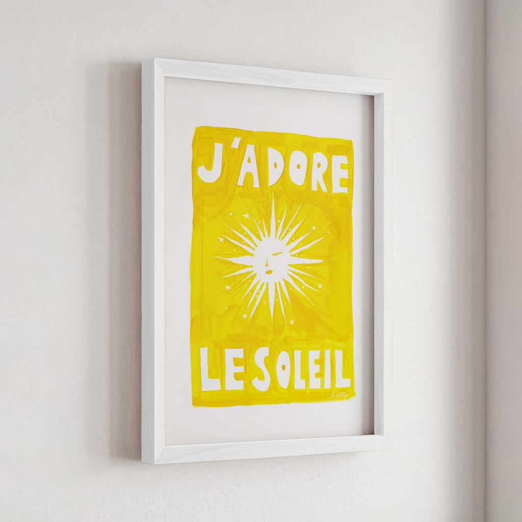 "J'adore le Soleil," meaning "I adore the sun" in French, is a bold handprinted print that embodies the sentiment of a love letter from the sun. Painted in a warm yellow, This print is designed to add a touch of the sunshine to your home.