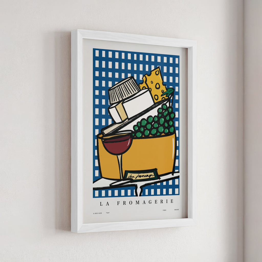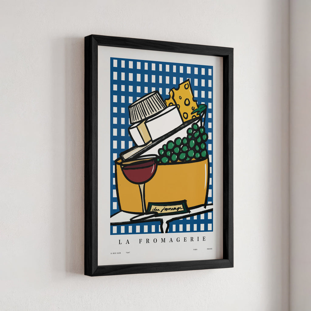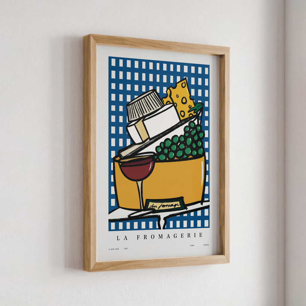"La Fromagerie" celebrates the art of cheese in print form. This Parisian-inspired artwork is a delectable tribute to the charming fromageries in France.