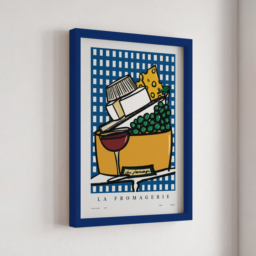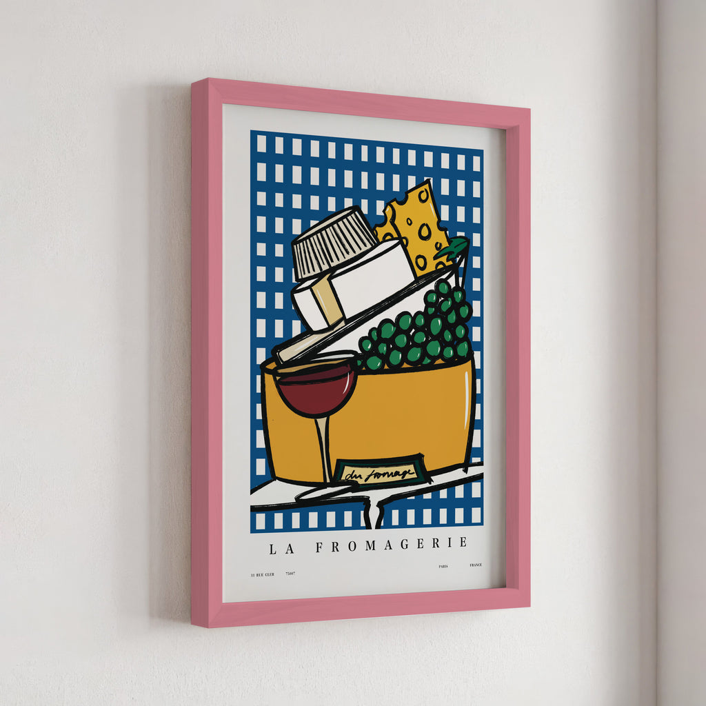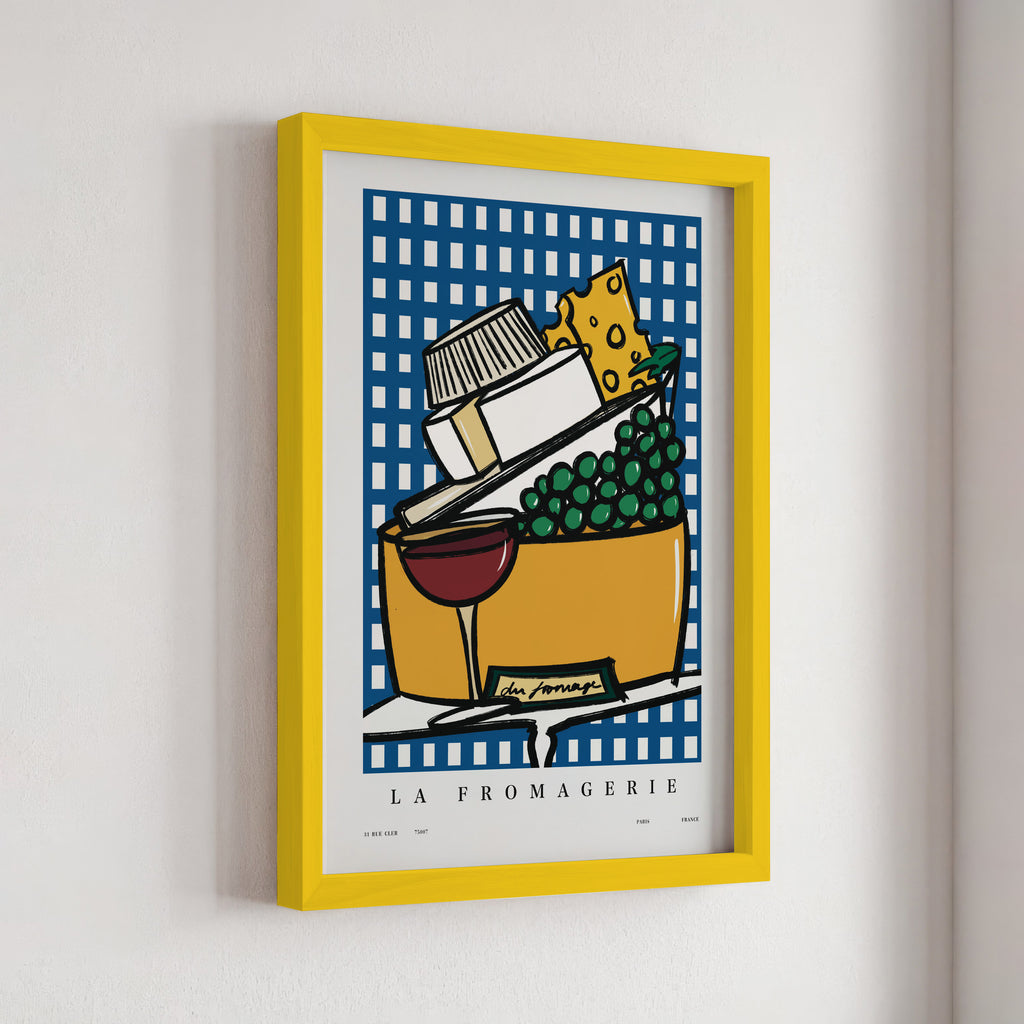 "La Fromagerie" celebrates the art of cheese in print form. This Parisian-inspired artwork is a delectable tribute to the charming fromageries in France.
