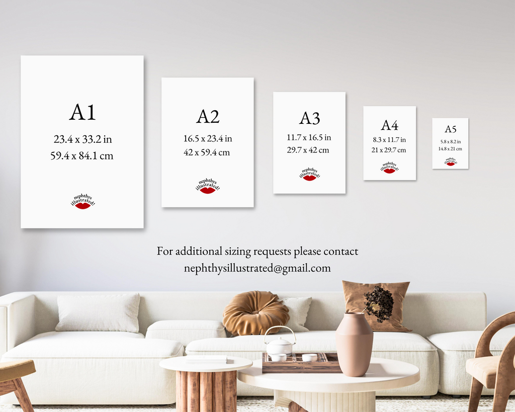 Note: All measurements are given as width x height. For custom sizes please contact hello@nephthysillustrated.com