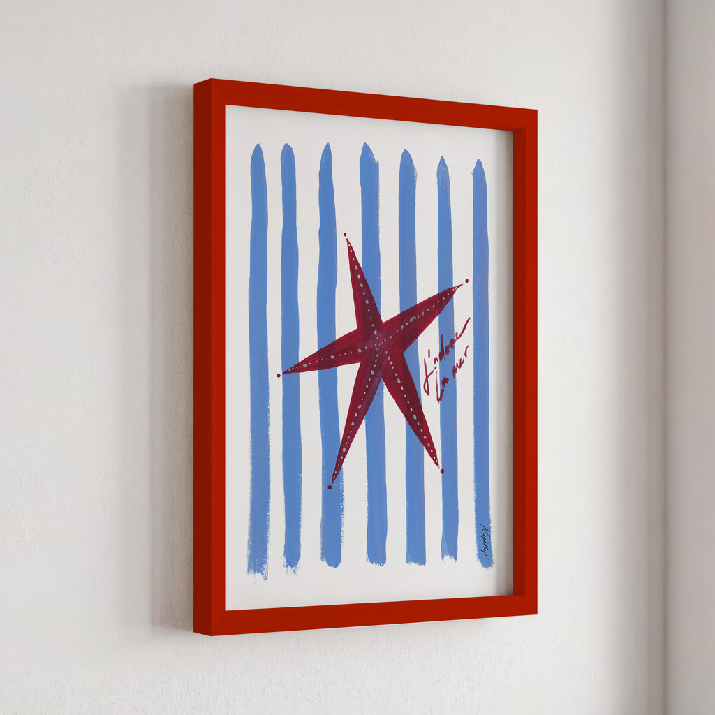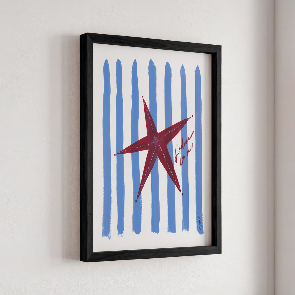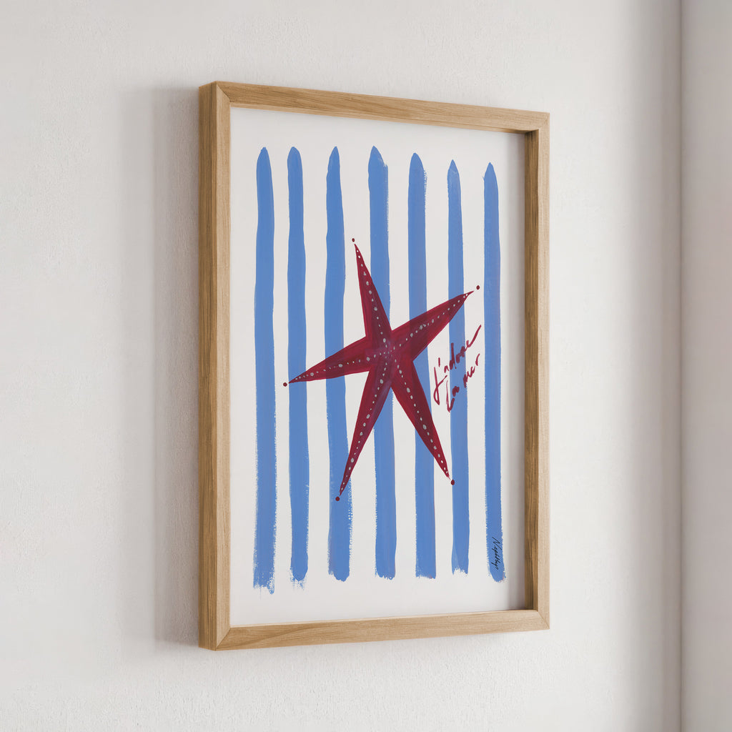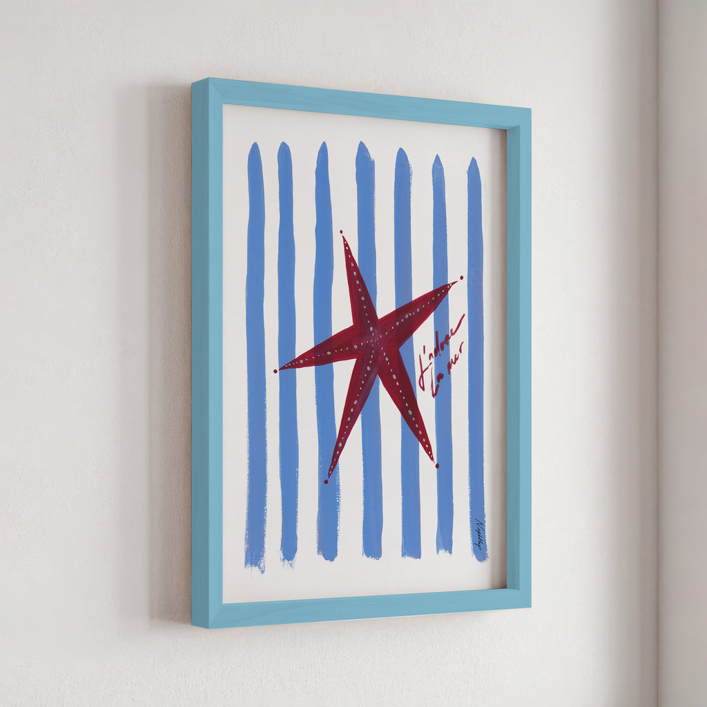 This nautical striped blue starfish print is designed to capture a delightful sense of the sea in your home. Featuring a bold red star and intricate metallic detailing, it brings a maritime charm to any space.