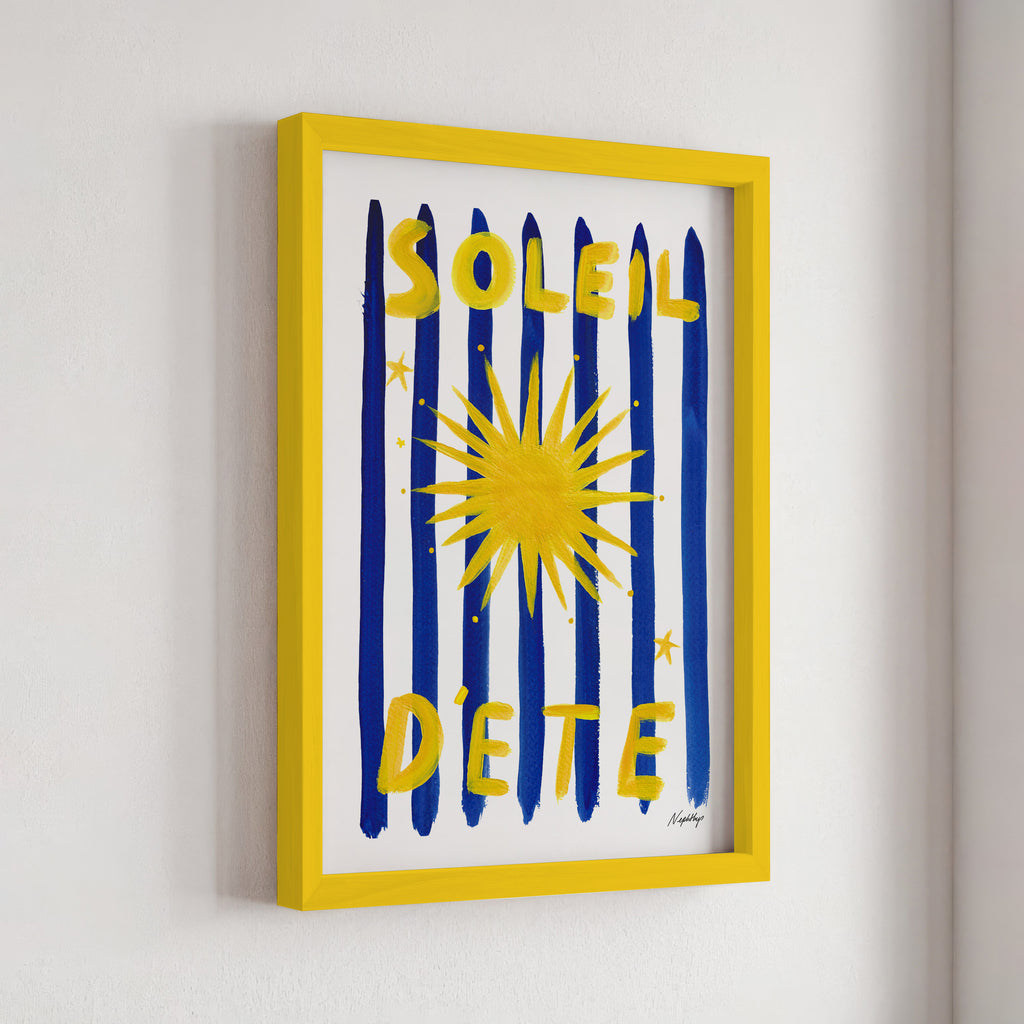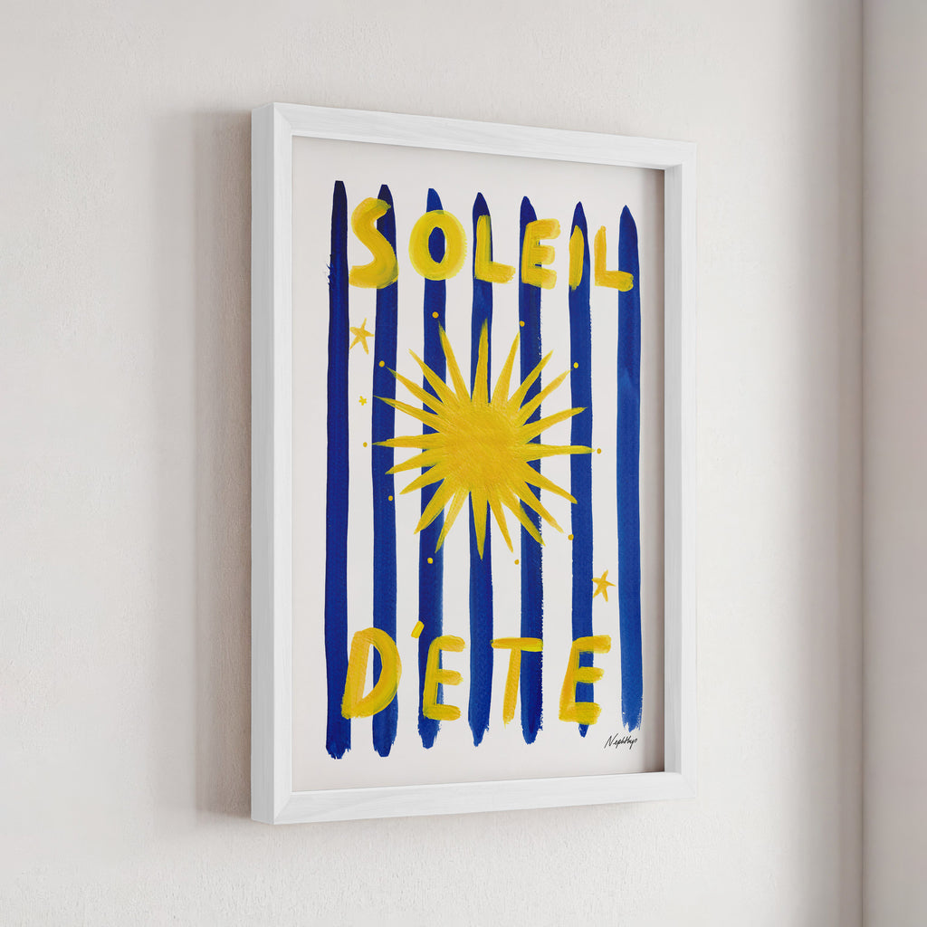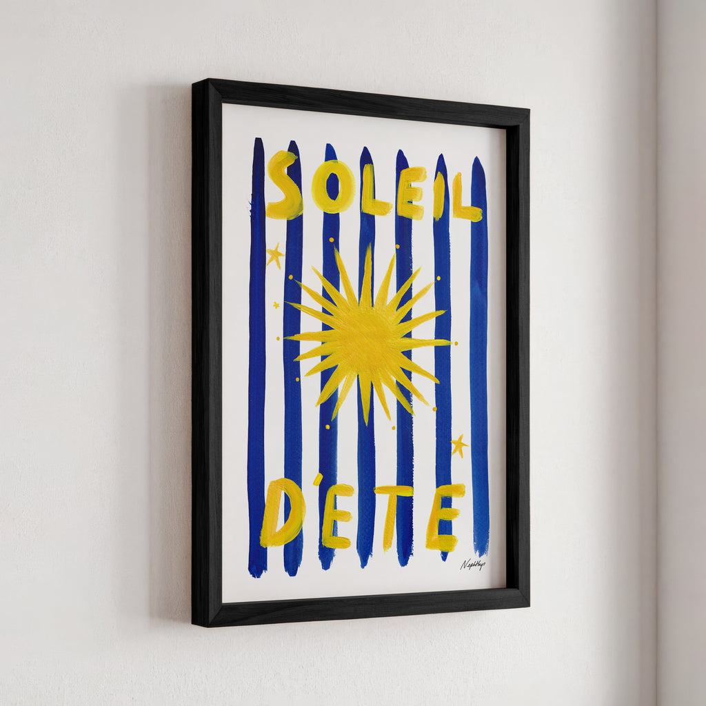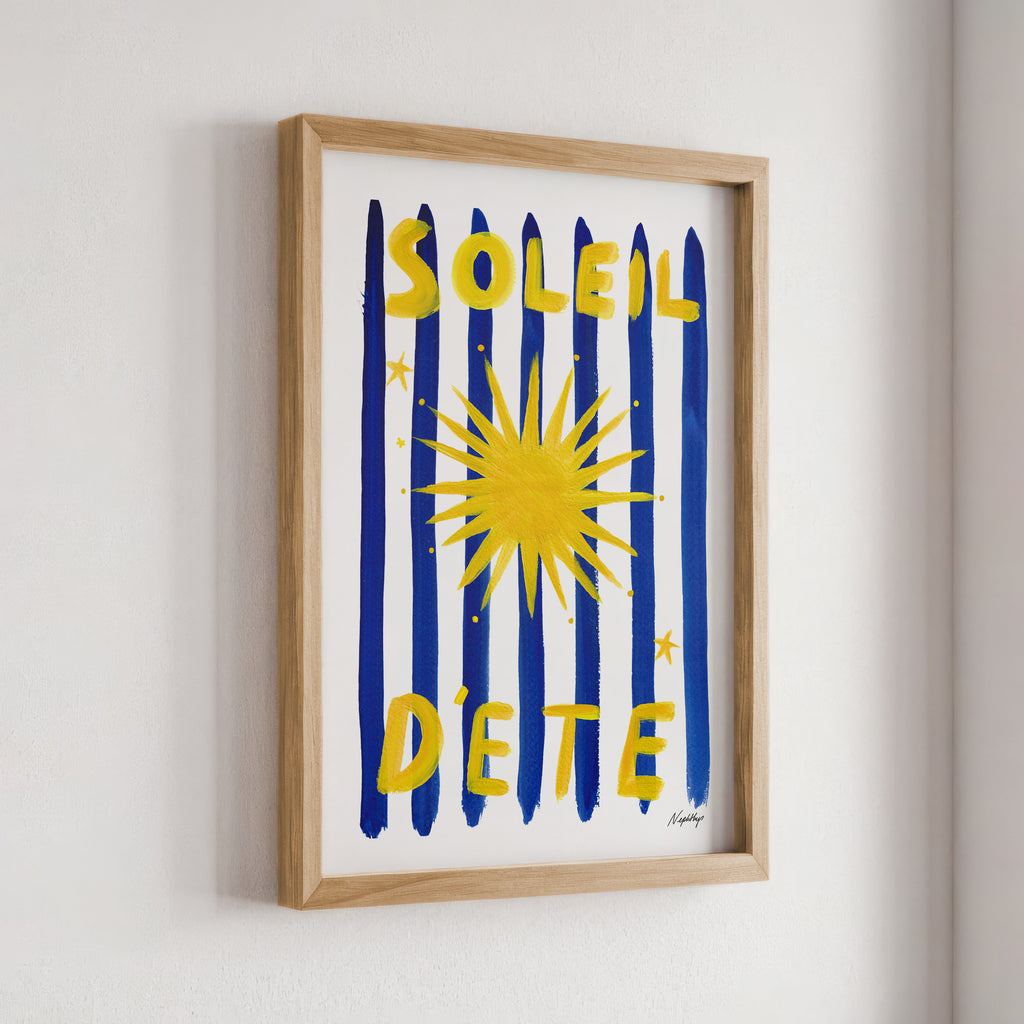 Soleil d'été is a print capturing the essence of the sweet summer sun. Featuring Nephthys's signature stripes in aquamarine blue complemented by a bold sun illustration it is designed to bring warmth into your home.