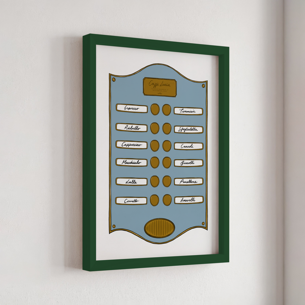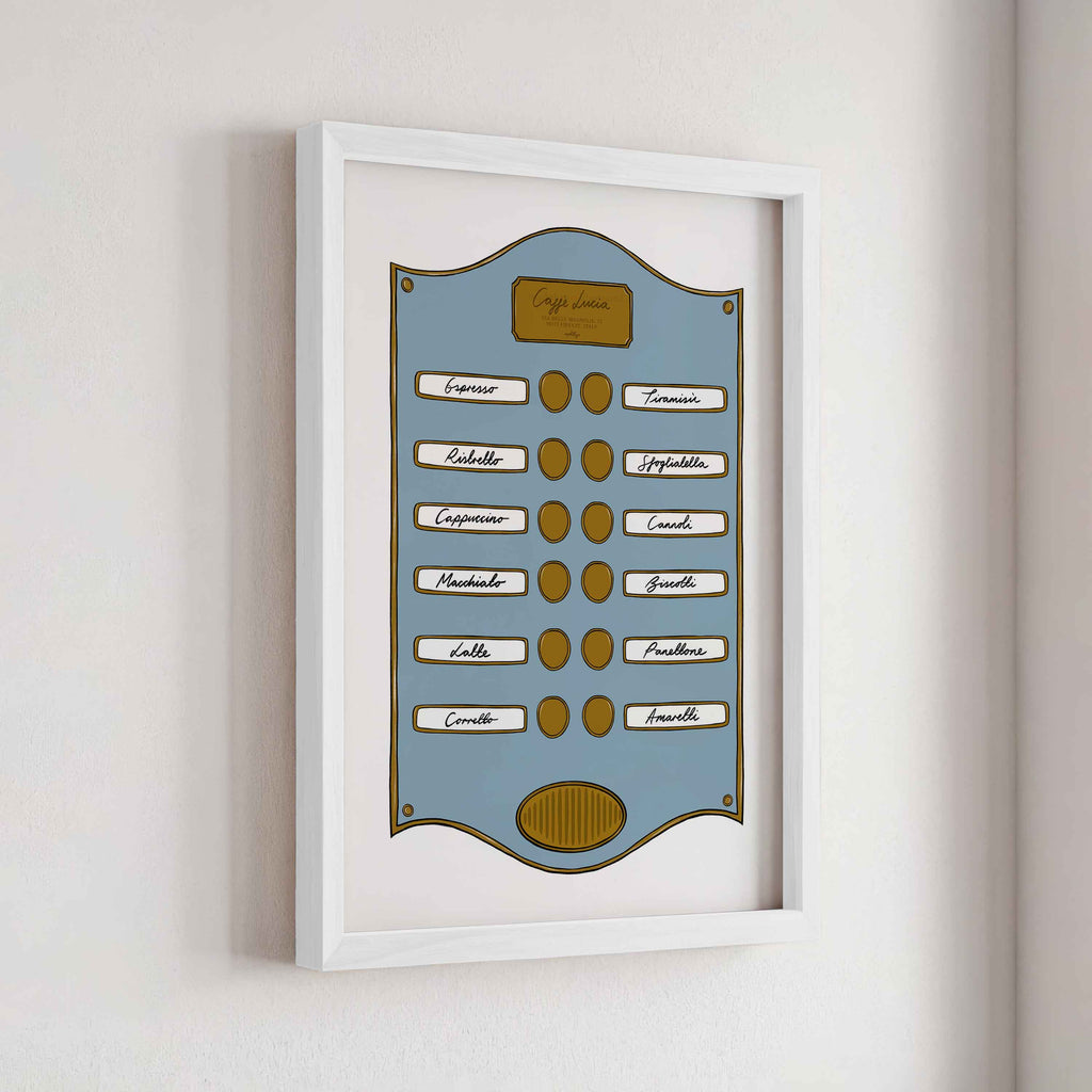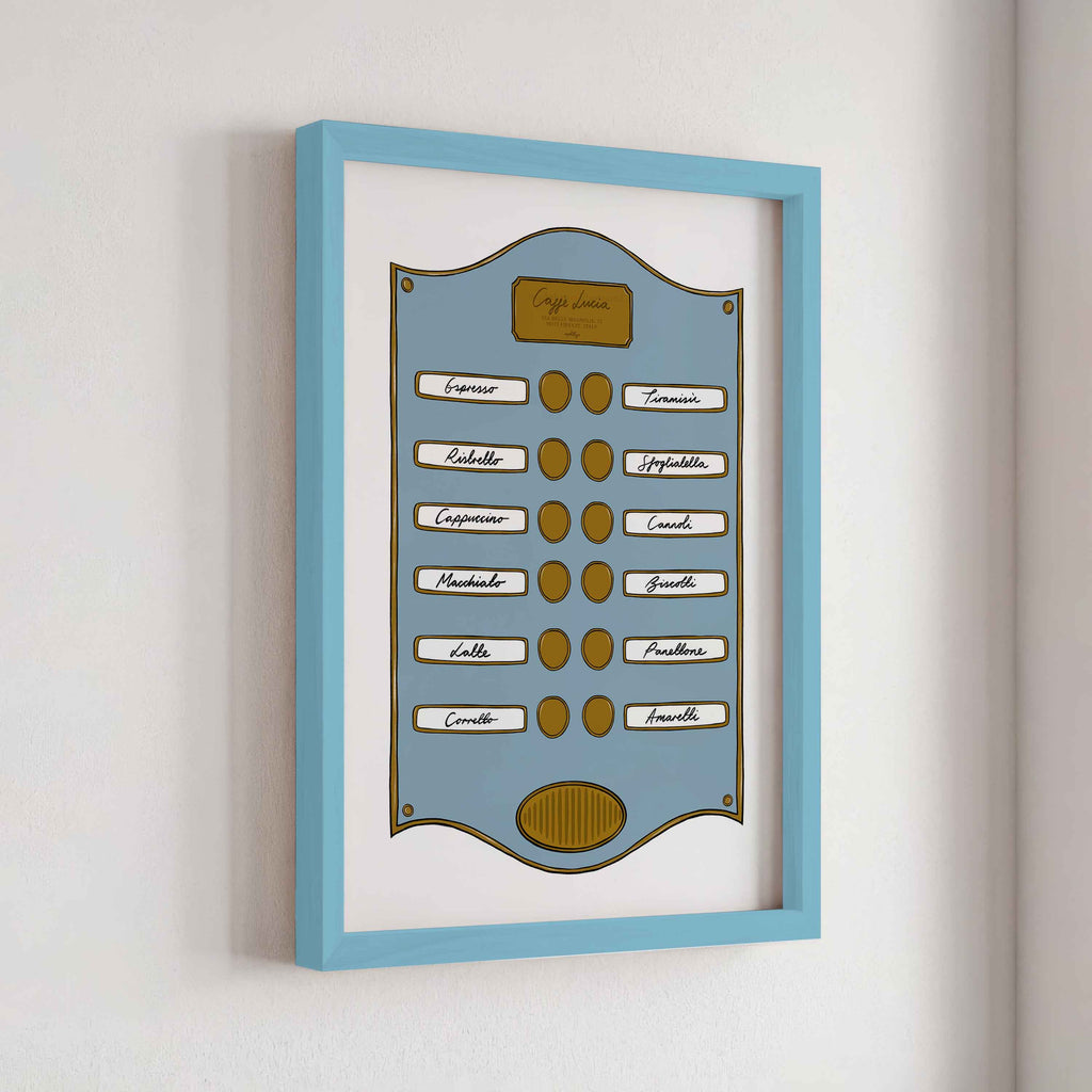 Introducing our Intercom Collection – a set of prints inspired by intercom designs, featuring plaques like Soho Suite, Pizzeria, Le Bar Jardin, and Caffè Lucia. Each print is designed to celebrate the experience of hotel life, from pizza and drink menus to the welcoming atmosphere of a coffee shop.