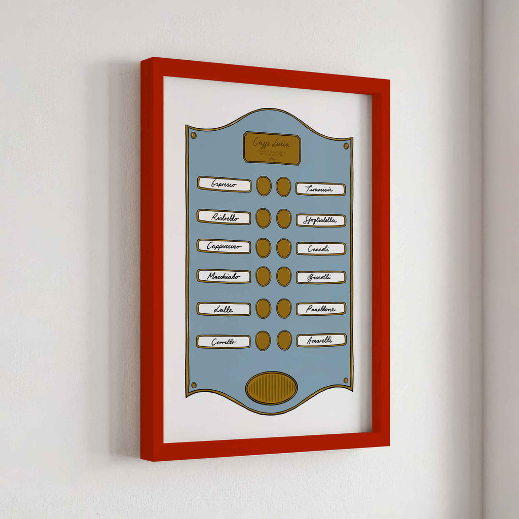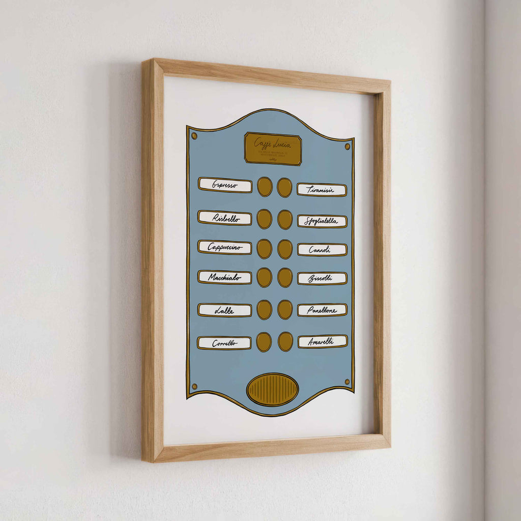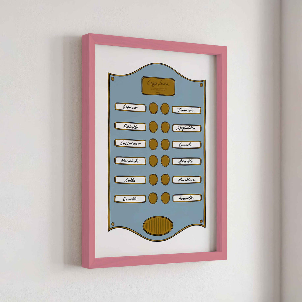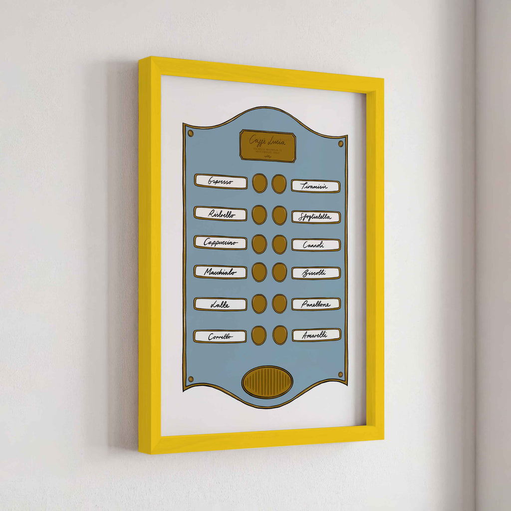 Introducing our Intercom Collection – a set of prints inspired by intercom designs, featuring plaques like Soho Suite, Pizzeria, Le Bar Jardin, and Caffè Lucia. Each print is designed to celebrate the experience of hotel life, from pizza and drink menus to the welcoming atmosphere of a coffee shop.