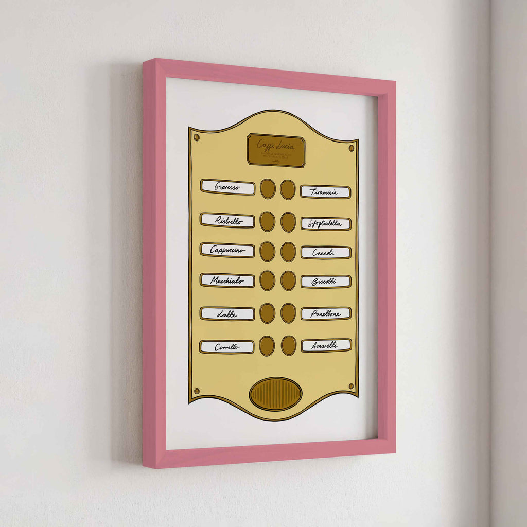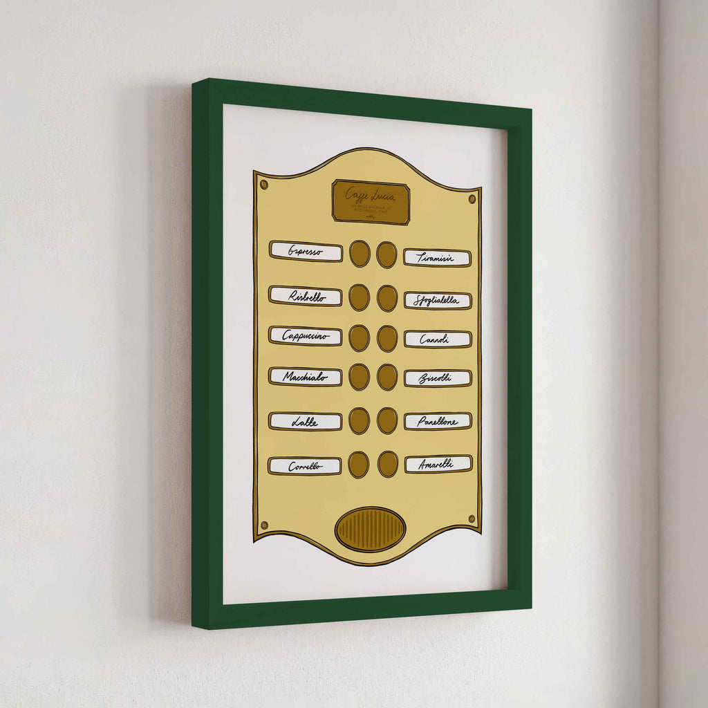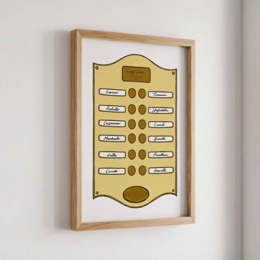 Introducing our Intercom Collection – a set of prints inspired by intercom designs, featuring plaques like Soho Suite, Pizzeria, Le Bar Jardin, and Caffè Lucia. Each print is designed to celebrate the experience of hotel life, from pizza and drink menus to the welcoming atmosphere of a coffee shop.