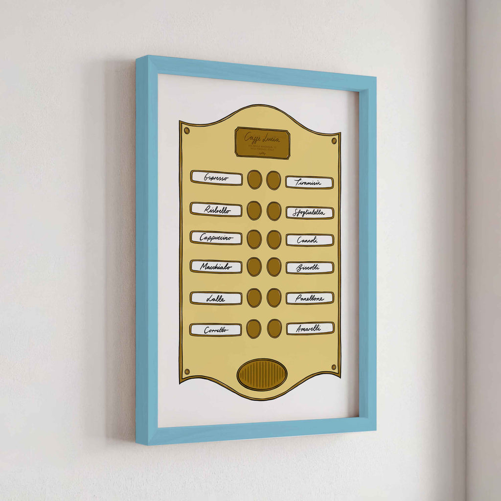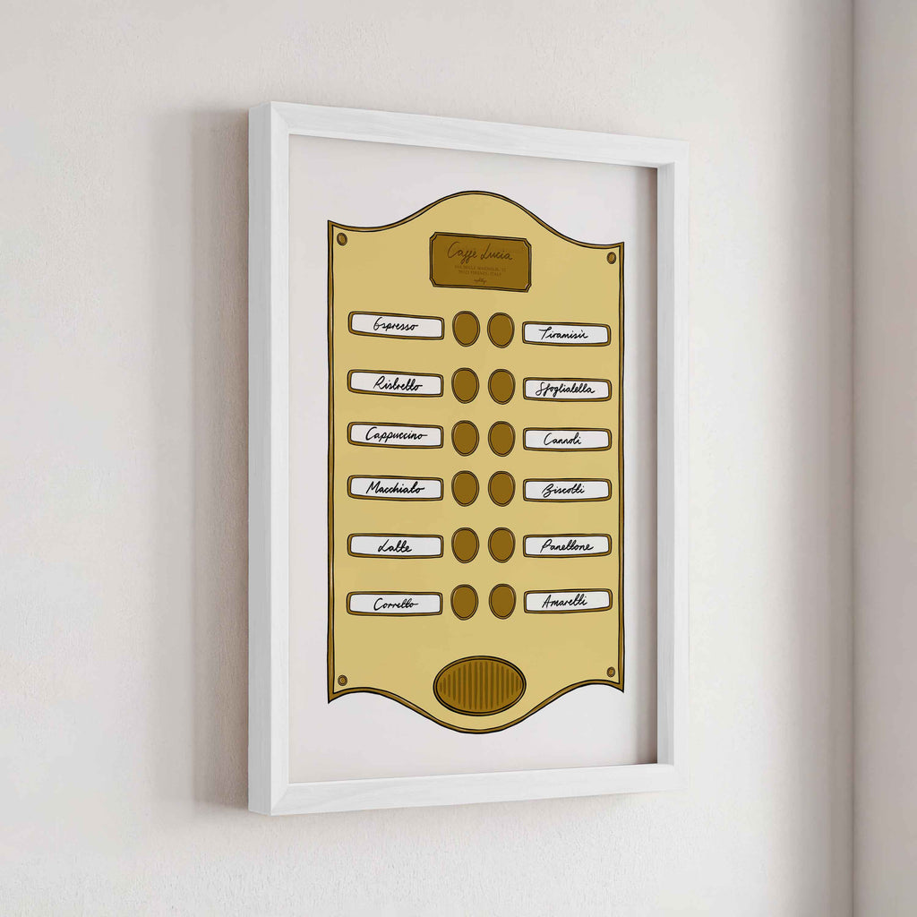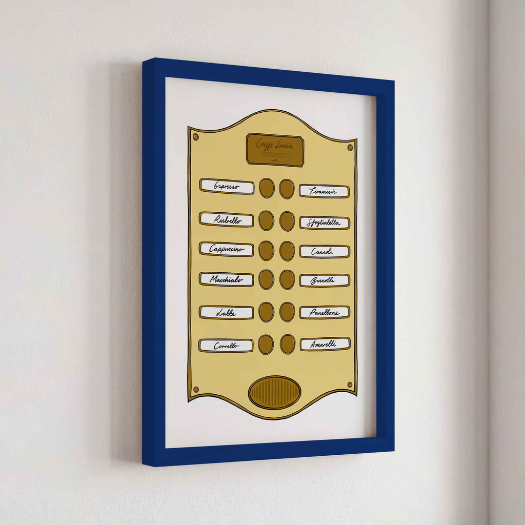 Introducing our Intercom Collection – a set of prints inspired by intercom designs, featuring plaques like Soho Suite, Pizzeria, Le Bar Jardin, and Caffè Lucia. Each print is designed to celebrate the experience of hotel life, from pizza and drink menus to the welcoming atmosphere of a coffee shop.