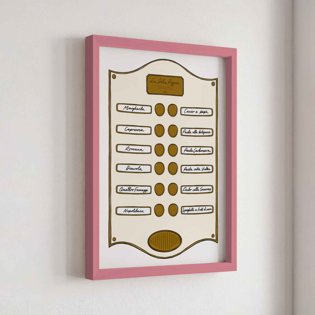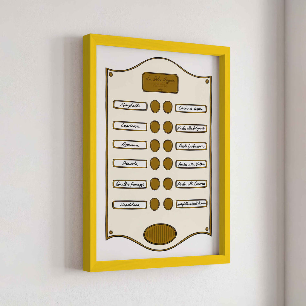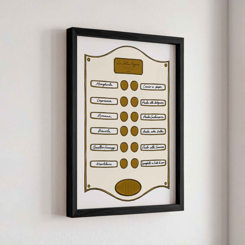 Introducing our Intercom Collection – a set of prints inspired by intercom designs, featuring plaques like Soho Suite, Pizzeria, Le Bar Jardin, and Caffè Lucia. Each print is designed to celebrate the experience of hotel life, from pizza and drink menus to the welcoming atmosphere of a coffee shop.