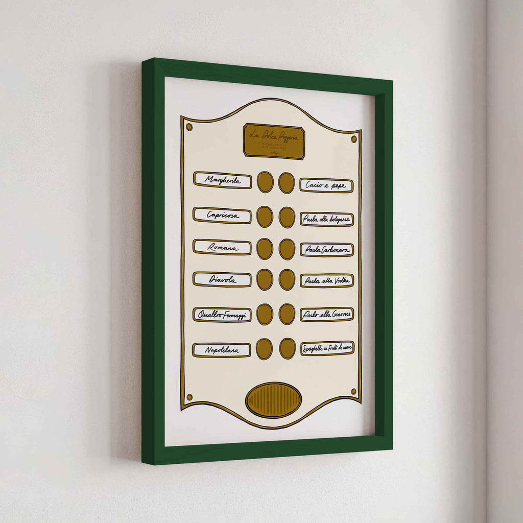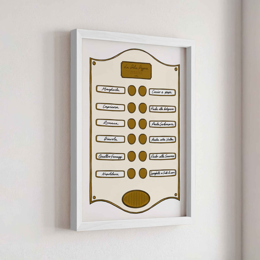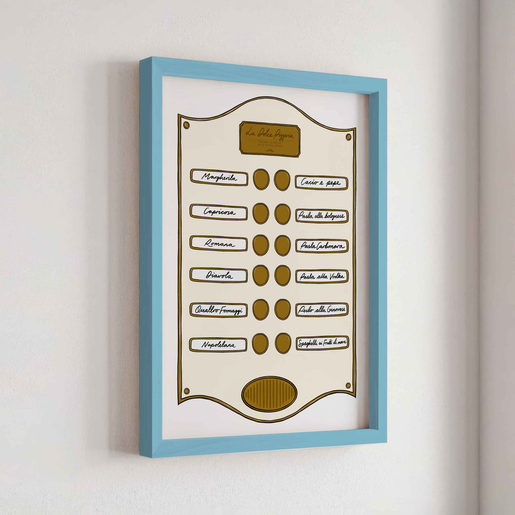 Introducing our Intercom Collection – a set of prints inspired by intercom designs, featuring plaques like Soho Suite, Pizzeria, Le Bar Jardin, and Caffè Lucia. Each print is designed to celebrate the experience of hotel life, from pizza and drink menus to the welcoming atmosphere of a coffee shop.