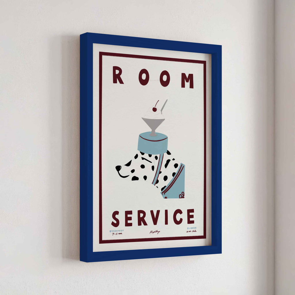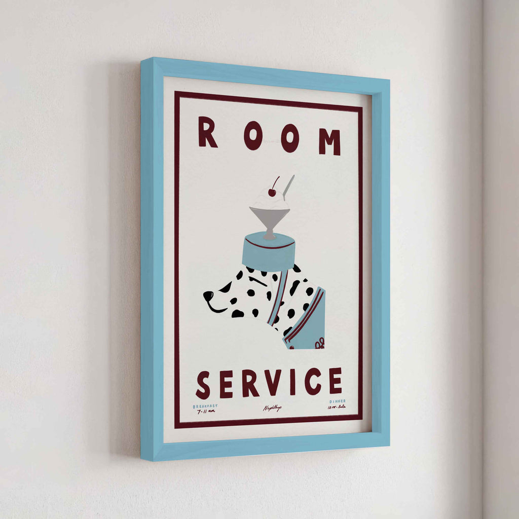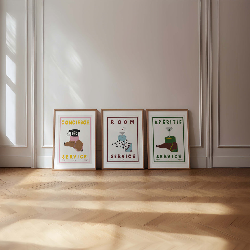 The Paw Seasons Collection features playful illustrations of dachshunds, Dalmatians, and cocker spaniels enjoying luxury hotel experiences. Inspired by our four-legged friends, these joyful art prints showcase canine companions enjoying "Concierge Service", "Late Checkout", "Room Service", and "Aperitif Service". Created for every room in the house.
