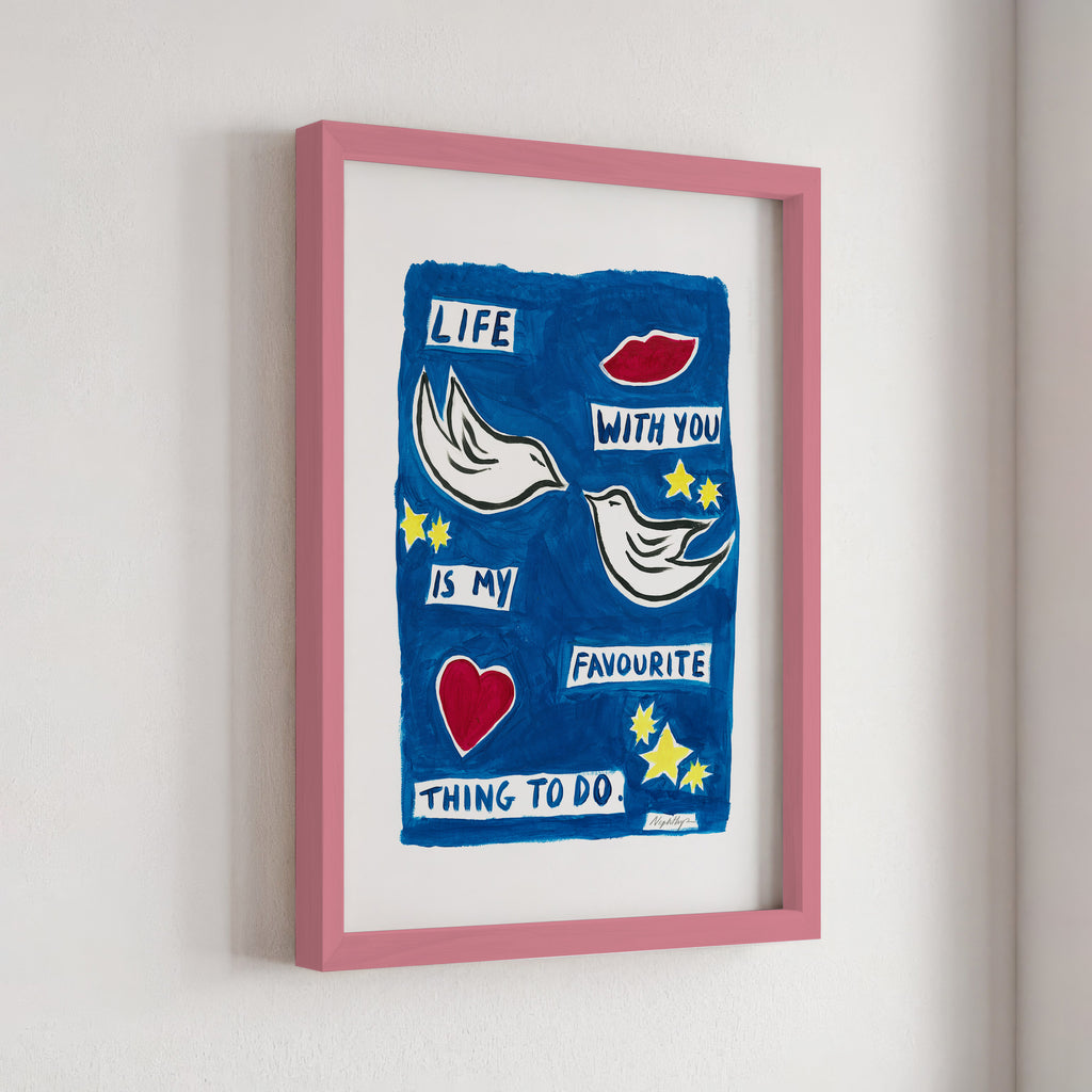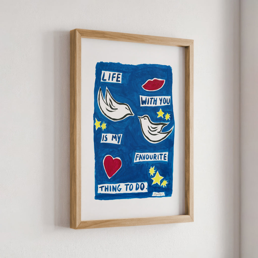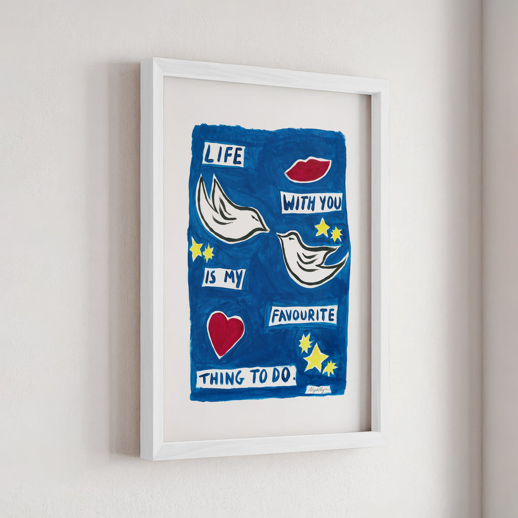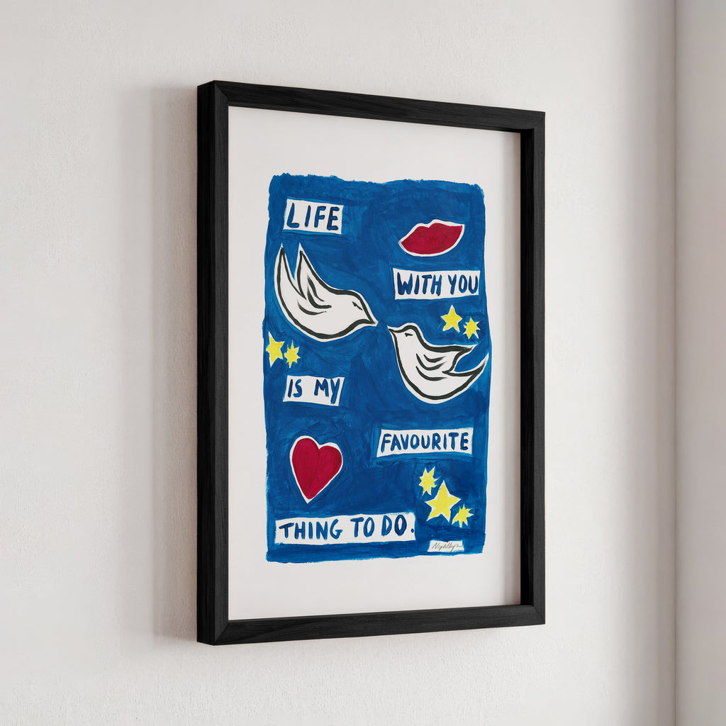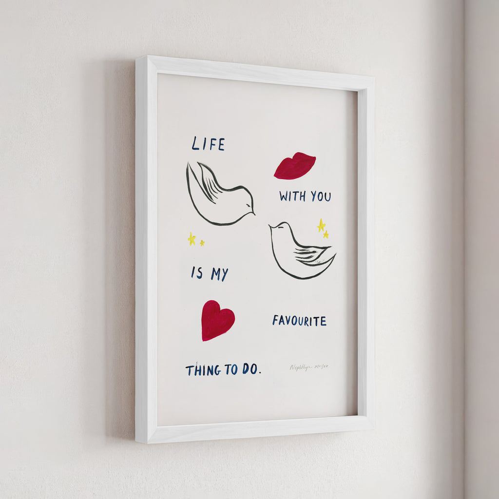 "Life with you is my favourite thing to do" is a print based on an original acrylic painting. It features the message in simple lettering, accompanied by two doves. This artwork celebrates the joy of companionship and shared moments, making it a meaningful addition to any home.