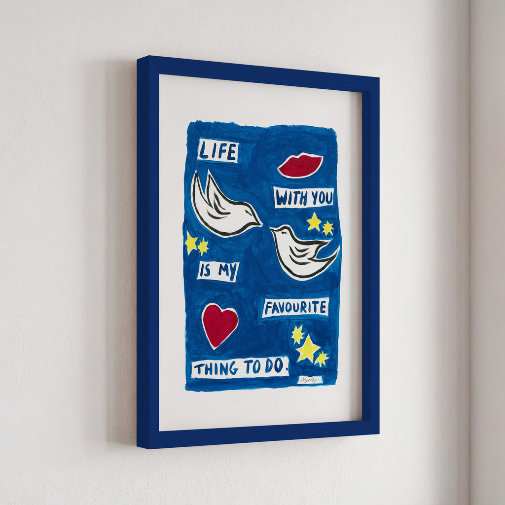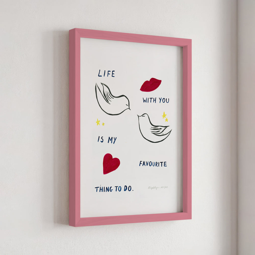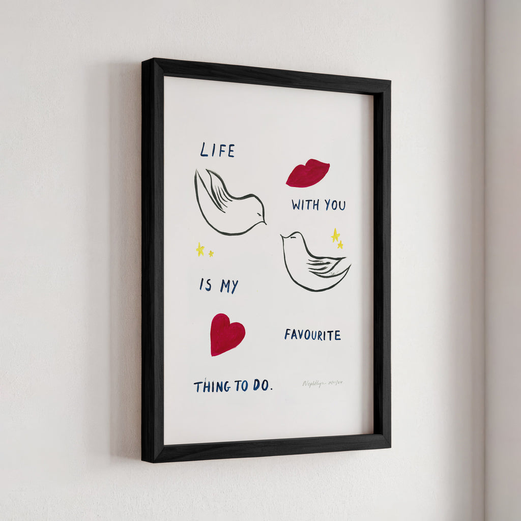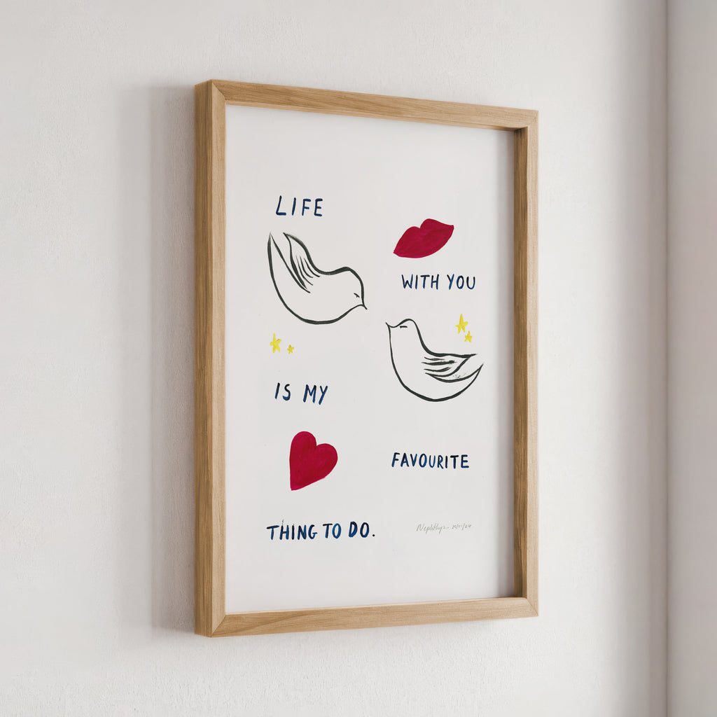 "Life with you is my favourite thing to do" is a print based on an original acrylic painting. It features the message in simple lettering, accompanied by two doves. This artwork celebrates the joy of companionship and shared moments, making it a meaningful addition to any home.