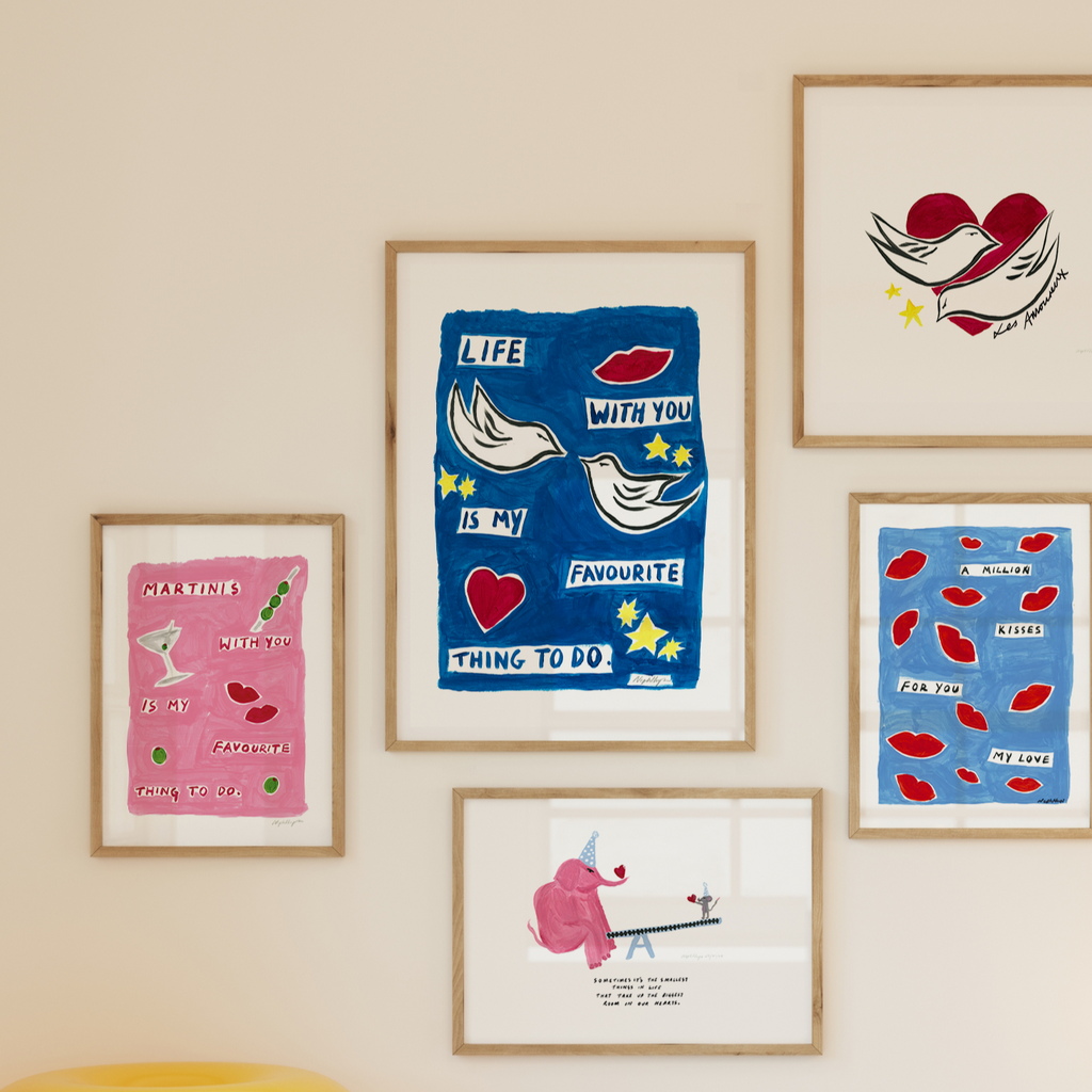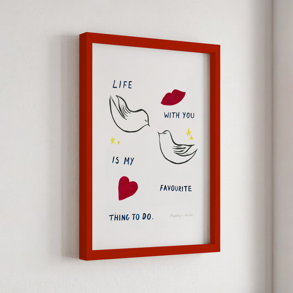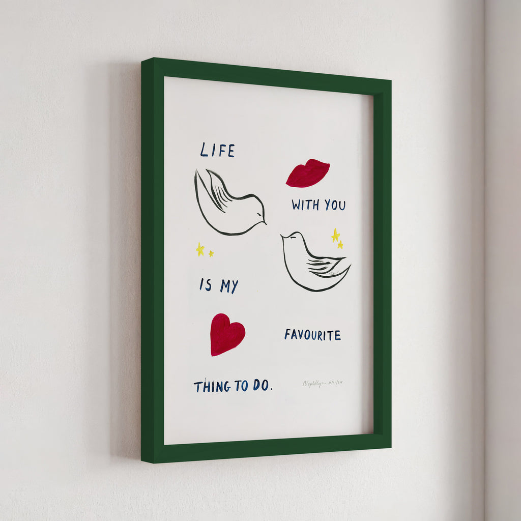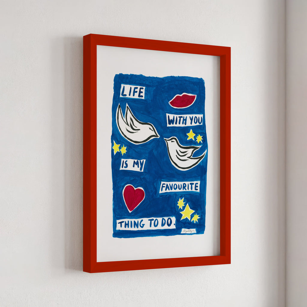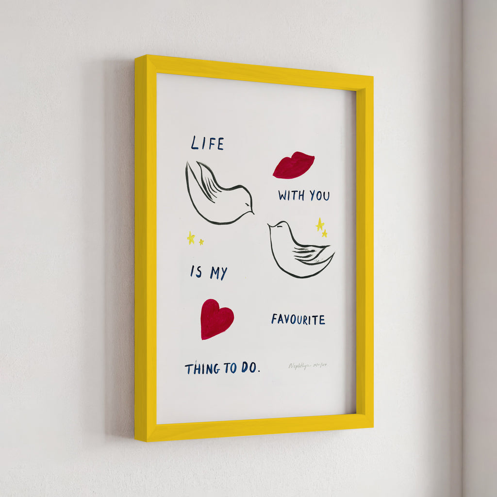 "Life with you is my favourite thing to do" is a print based on an original acrylic painting. It features the message in simple lettering, accompanied by two doves. This artwork celebrates the joy of companionship and shared moments, making it a meaningful addition to any home.