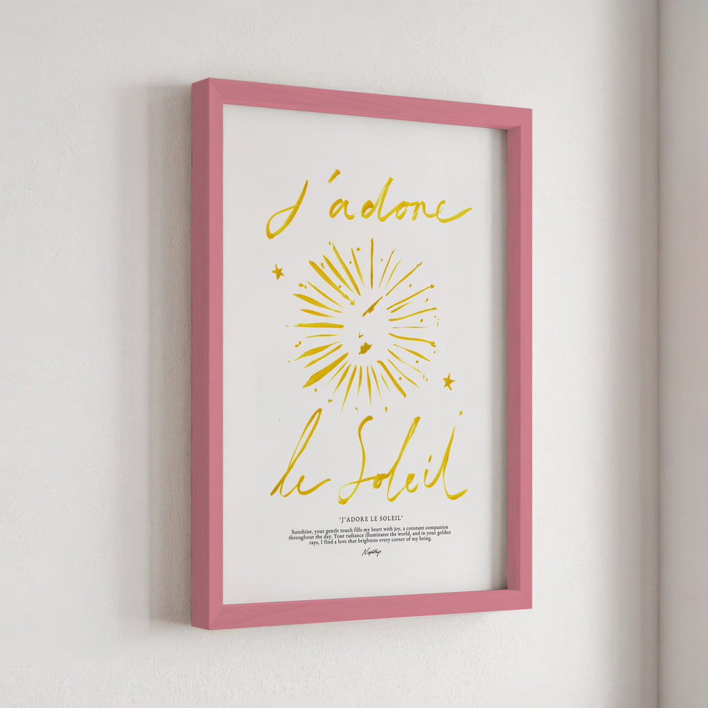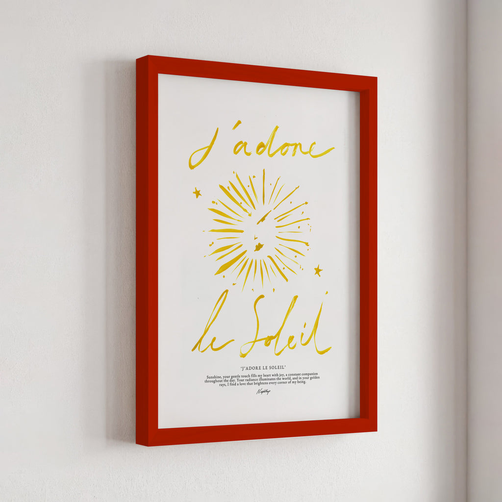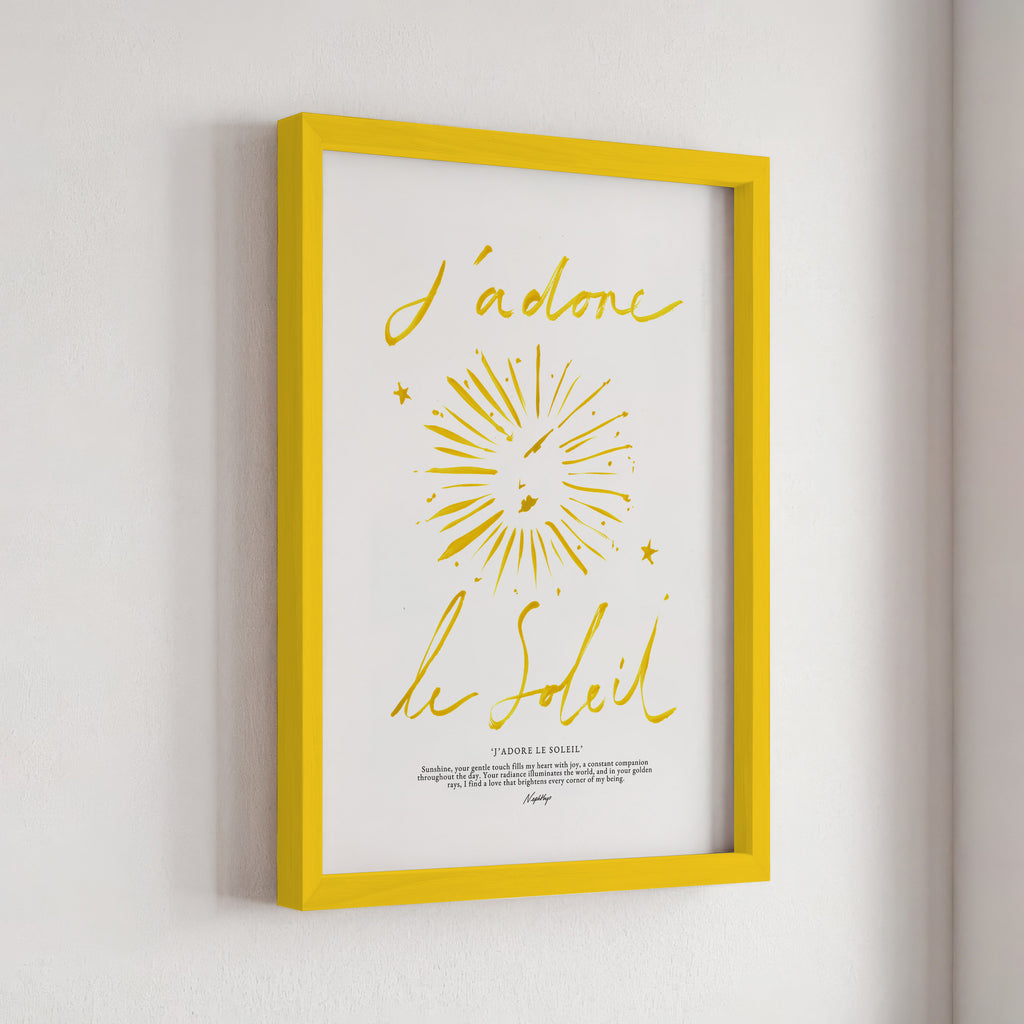 A stripped-down rendition of the original "J'adore le Soleil" print, focusing on simplicity and elegance. With coarse brush strokes and subtle details, it embodies the essence of adoration for the sun in its purest form, radiating warmth and joy.