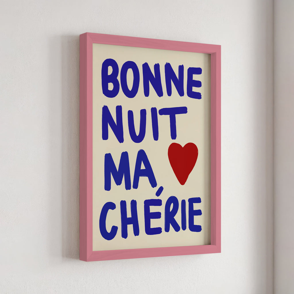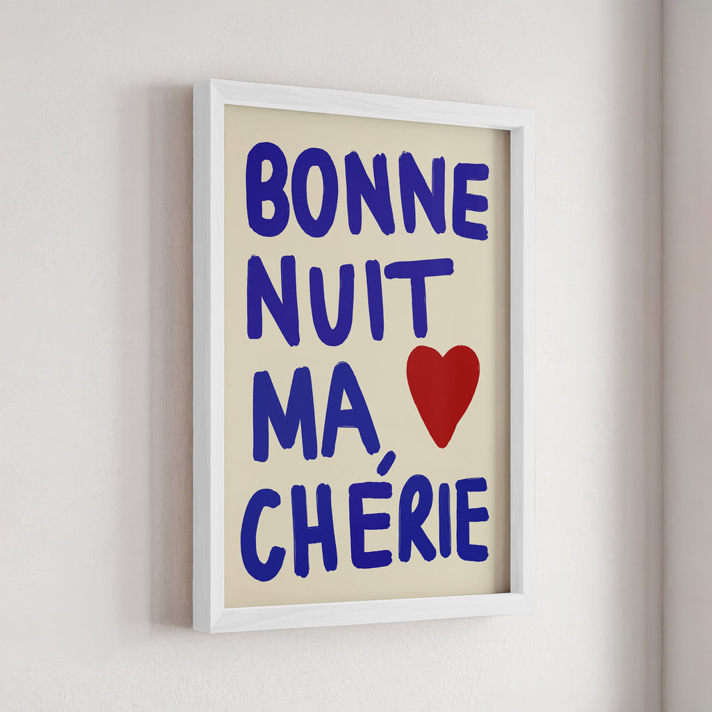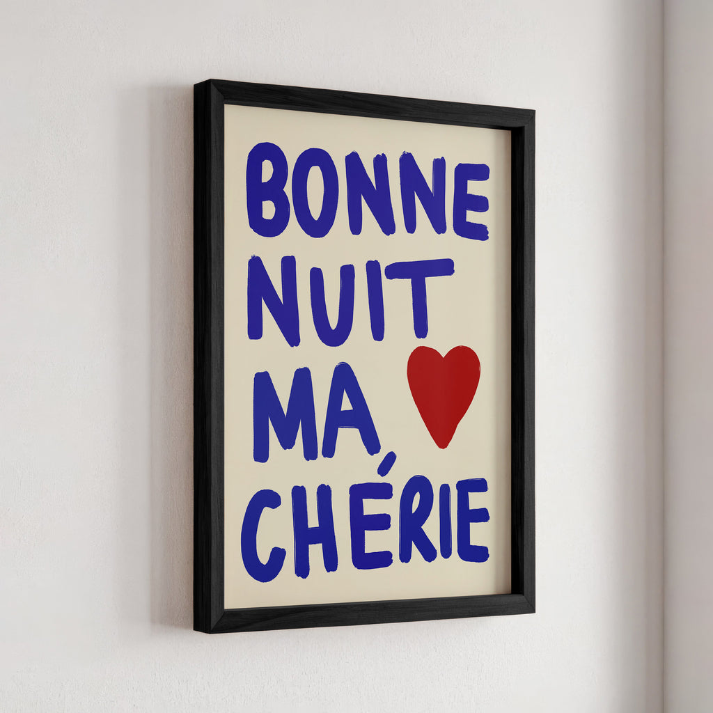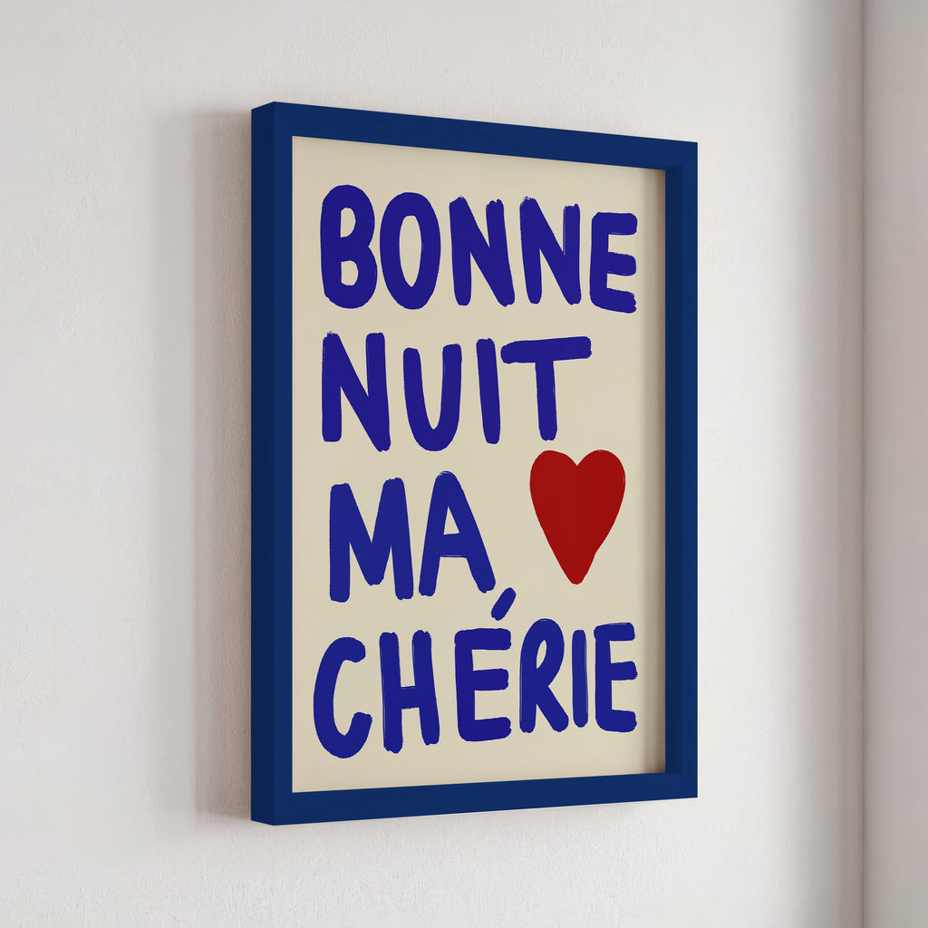 "Bonne nuit ma chérie," meaning "Good Night My Darling" in French, is undeniably one of our most popular prints. You may have spotted it on your Instagram feeds. With bold, painted acrylic blue letters, it adds a touch of charm perfect for any room and for all ages.