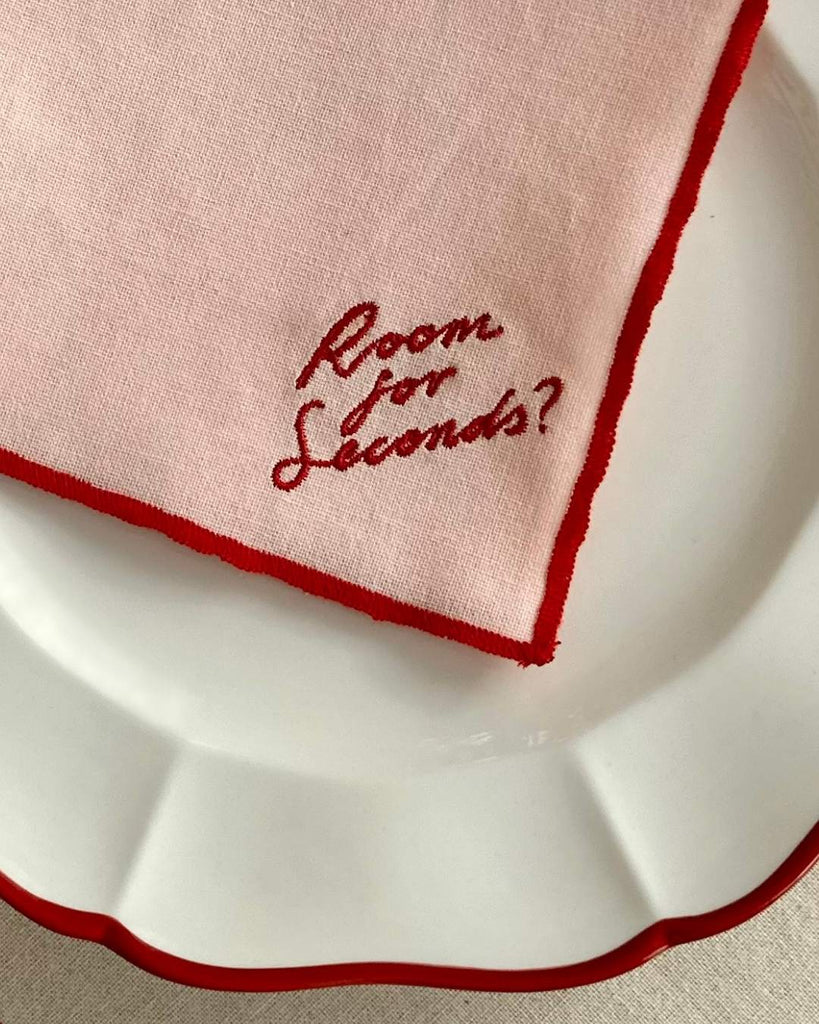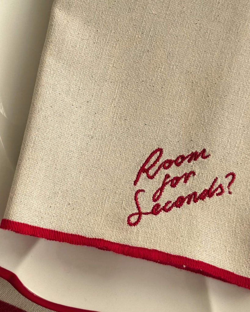 A set of four embroidered cotton napkins designed to add a playful touch to your table. Each napkin features “Room for Seconds?” stitched in a rich red thread, with a matching red trim that feels classic rather than overly festive.